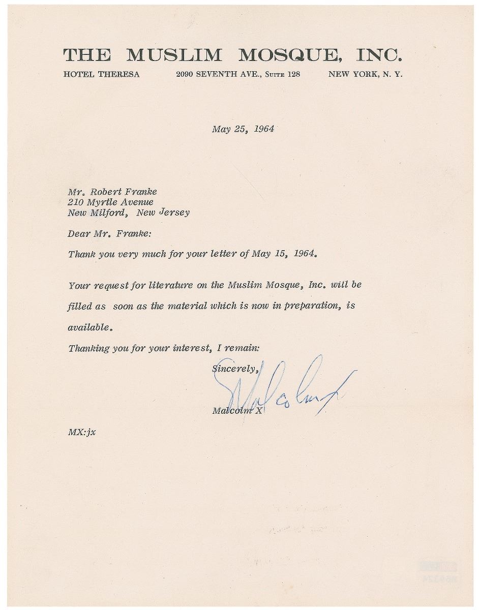 Four days after announcing his departure from the Nation of Islam on March 8, Malcolm X established Muslim Mosque, Inc., an Islamic organization designed to support the African-American community and propagate the social, economic, and political philosophies of Black Nationalism. Although his new foundation was headquartered at Harlem’s 113th street mosque, Malcolm X would spend much of his remaining life traveling abroad. After completing his pilgrimage to Mecca in April 1964 and spending significant time in Africa, where he met with nearly all of the continent’s prominent leaders, his philosophy on the white presence in Muslim culture began to evolve, causing confusion with many of his followers in the states. Signed during this critical period of enlightenment and transformation—just nine months before his assassination—this is an exceedingly rare letter from one of history’s most divisive and important civil rights leaders.