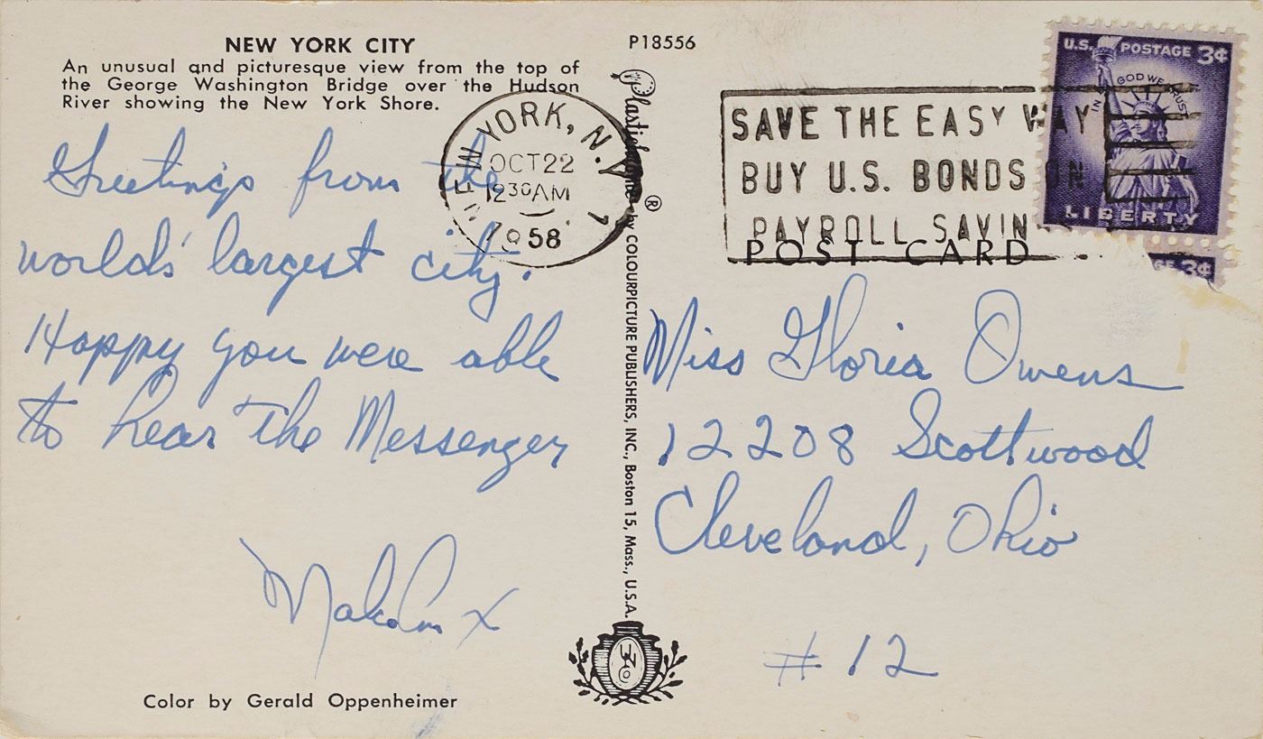 Rare ALS signed "Malcolm X," one page on a color 5.5 x 3.5 postcard depicting New York City, postmarked October 22, 1958. Letter to Gloria Owens, in full: "Greetings from the world's largest city. Happy you were able to hear The Messenger." In fine condition. Gloria Owens was the sister of Maceo X Owens, secretary at Muhammad's Mosque No. 7 in Harlem where Malcolm X preached alongside Louis Farrakhan. A decidedly rare, important autograph boasting a fine association.