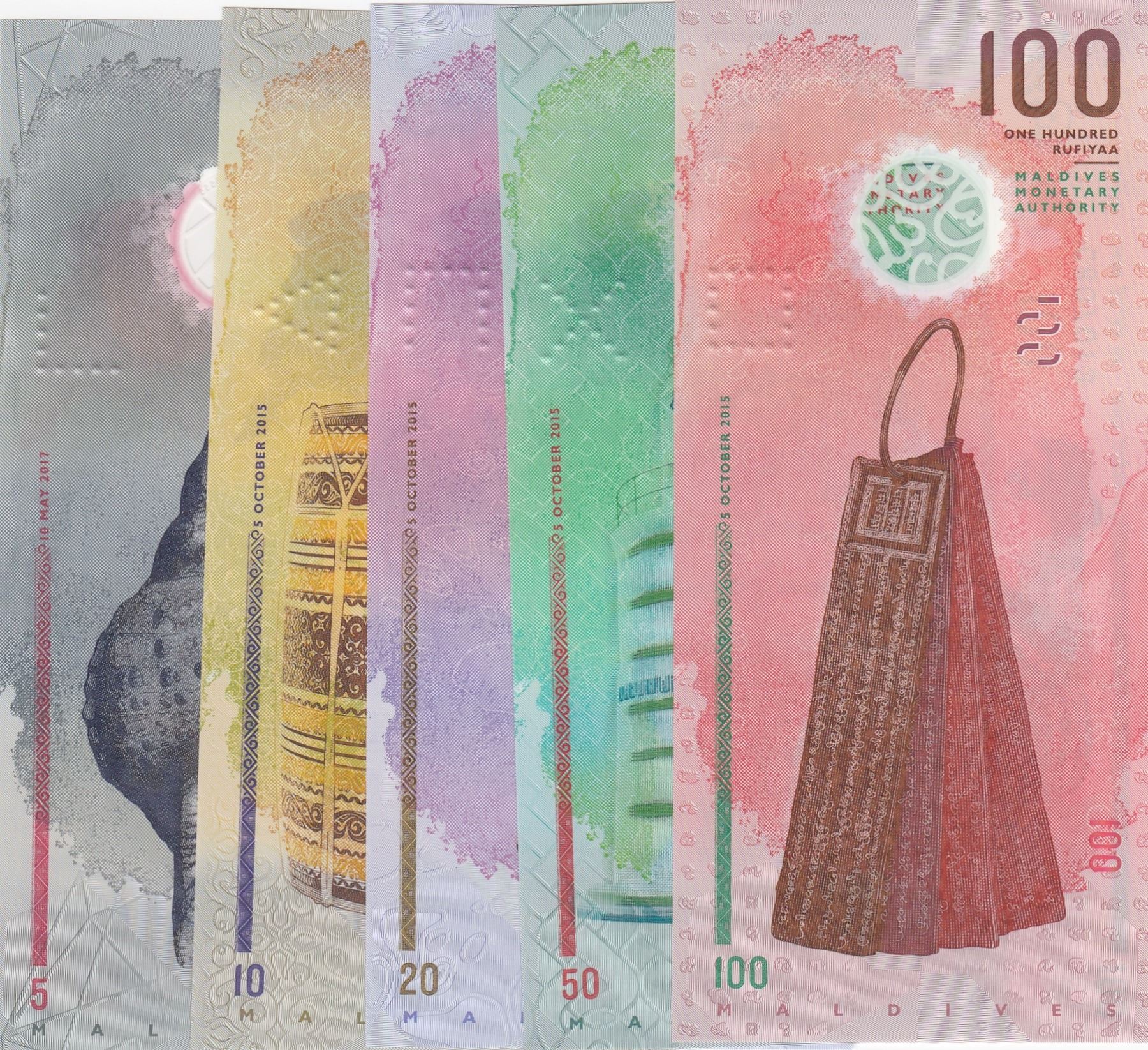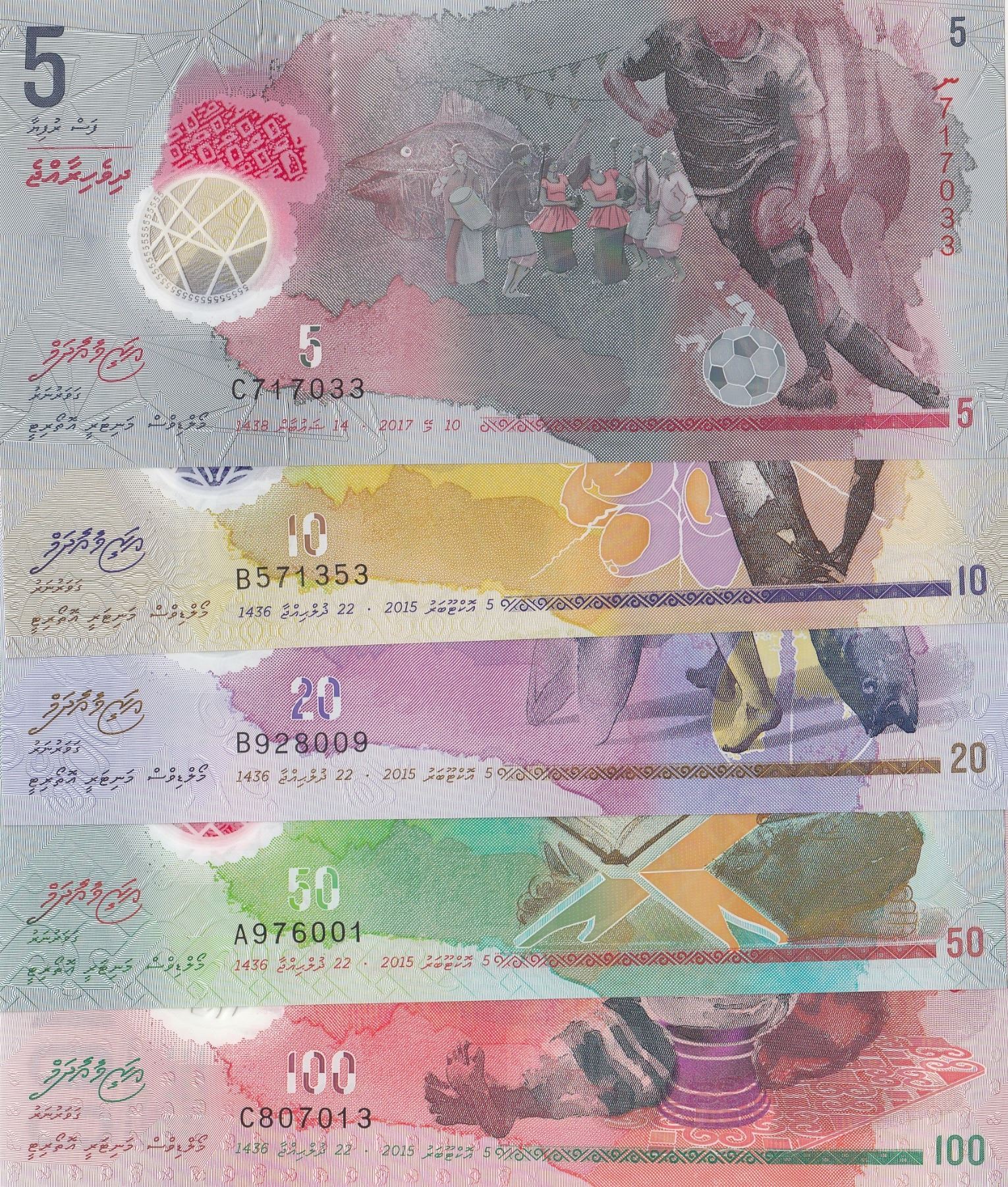 Maldives, 5 Rupiah, 10 Rupiah, 20 Rupiah, 50 Rupiah and 100 Rupiah, 2015, UNC, SET, (Total 5 baknotes)br/plastic
