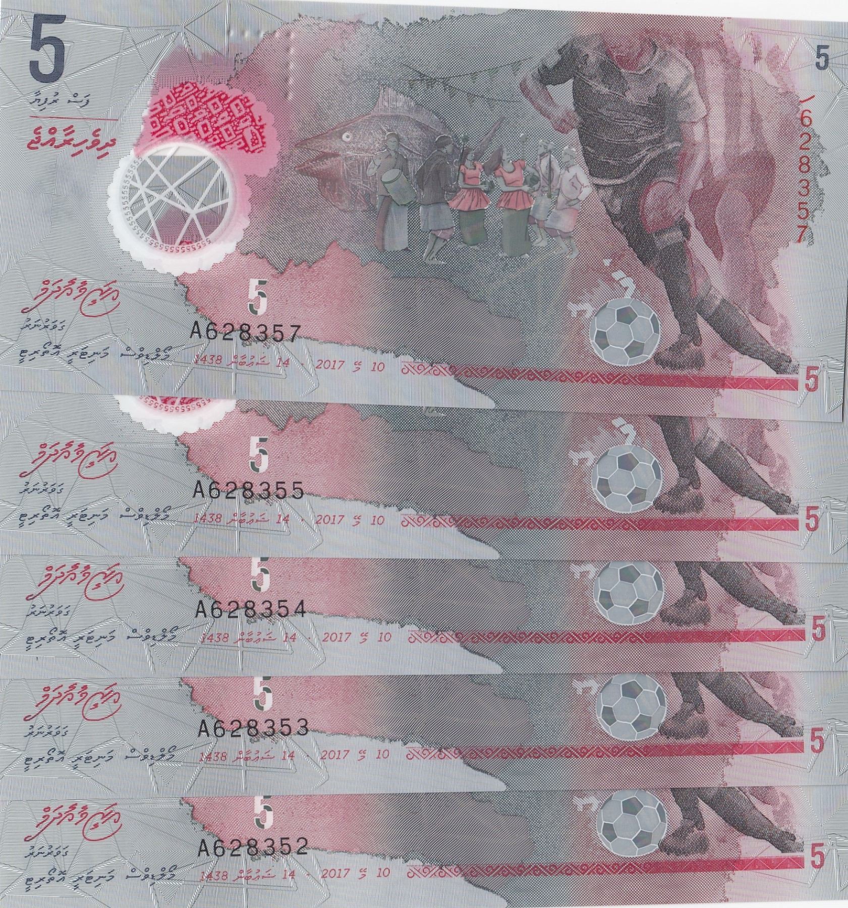 Maldives, 5 Rupiah (5), 2017, UNC, pNew, (Total 5 baknotes)br/serial numbers: A628352-55 and A628357