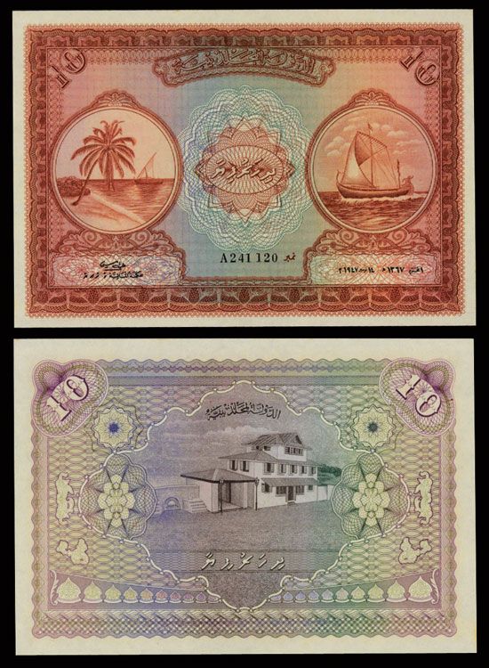Maldives, 1947 / AH1367, 10 Rupees, P-5a, Issued banknote Brown and m/c with Palm tree and Dhow at left and Dhow at right, back green, brown and m/c, PMG graded Gem Uncirculated 66 - EPQ (Exceptional Paper Quality), Scarce note that is rarely found in in superb condition.