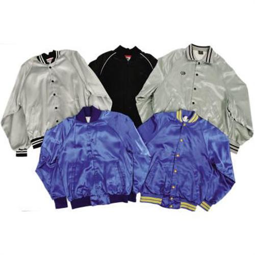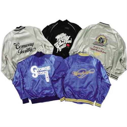 <B>Male Country Artists Tour Jacket Set.</B></I> Includes a blue satin Marty Robbins tour jacket (M), blue satin George Jones Show tour jacket (M), light grey satin Conway Twitty tour jacket (XL), a silver satin Charlie Daniels Band Volunteer Jam VIII 1982 tour jacket (XL), and a black satin Willie Nelson "Willie and the Family Back on the Road Again" tour jacket (L). All are in Excellent condition with a couple of very small stains to the Daniels jacket.<BR><BR><b>Shipping:</b> Clothing, Costumes & Jerseys (<a target="_blank" href="http://www.heritageauctions.com/common/shipping.php">view shipping information</a>)