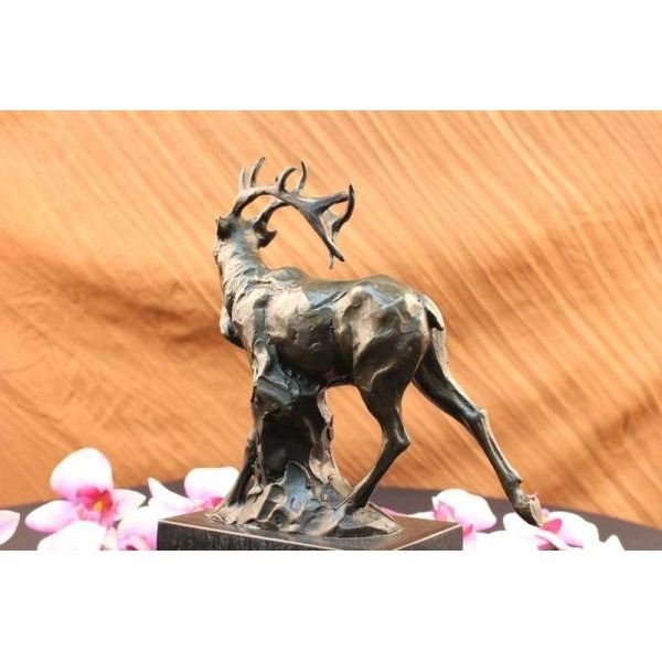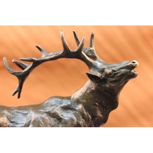 The male deer comes from the forest's edge offering a series of vocalizations for the mountains to echo across the sky and lands. He seems as though he is on a mission to find a mate. His crown of tall antlers will be used to for sparring antler wrestling with another male to gain the rights of dominance and courtship with the desired female. His back left leg is slightly kicked backwards as if he is getting ready for anything coming his way. The deer is known for many symbolic meanings such as love, gentleness, kindness, gracefulness, and sensitivity, purity of purpose, walking in the light, meditation, longevity and wealth. The bronze sculpture was cast using the age-old method of lost-wax casting and stained with a brown patina finish for perpetuation. He is mounted upon a black marble base. Bronze dimensions with marble base: Height 11 X Width 10 inches. Weight: 9 lbs.
