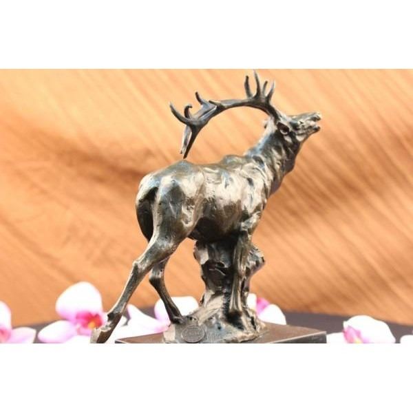 The male deer comes from the forest's edge offering a series of vocalizations for the mountains to echo across the sky and lands. He seems as though he is on a mission to find a mate. His crown of tall antlers will be used to for sparring antler wrestling with another male to gain the rights of dominance and courtship with the desired female. His back left leg is slightly kicked backwards as if he is getting ready for anything coming his way. The deer is known for many symbolic meanings such as love, gentleness, kindness, gracefulness, and sensitivity, purity of purpose, walking in the light, meditation, longevity and wealth. The bronze sculpture was cast using the age-old method of lost-wax casting and stained with a brown patina finish for perpetuation. He is mounted upon a black marble base. Bronze dimensions with marble base: Height 11 X Width 10 inches. Weight: 9 lbs.