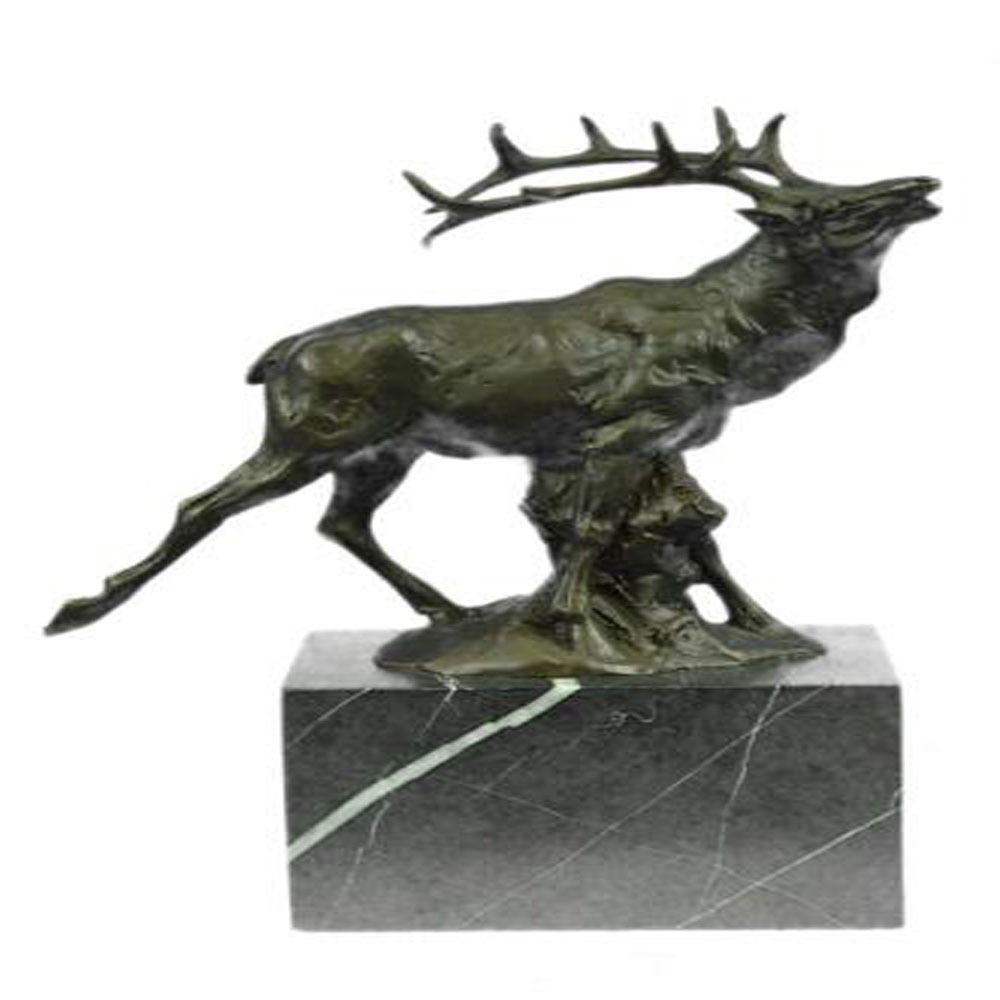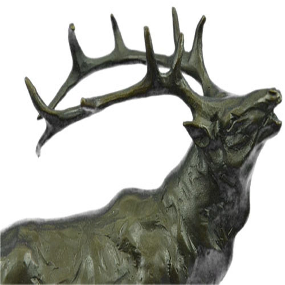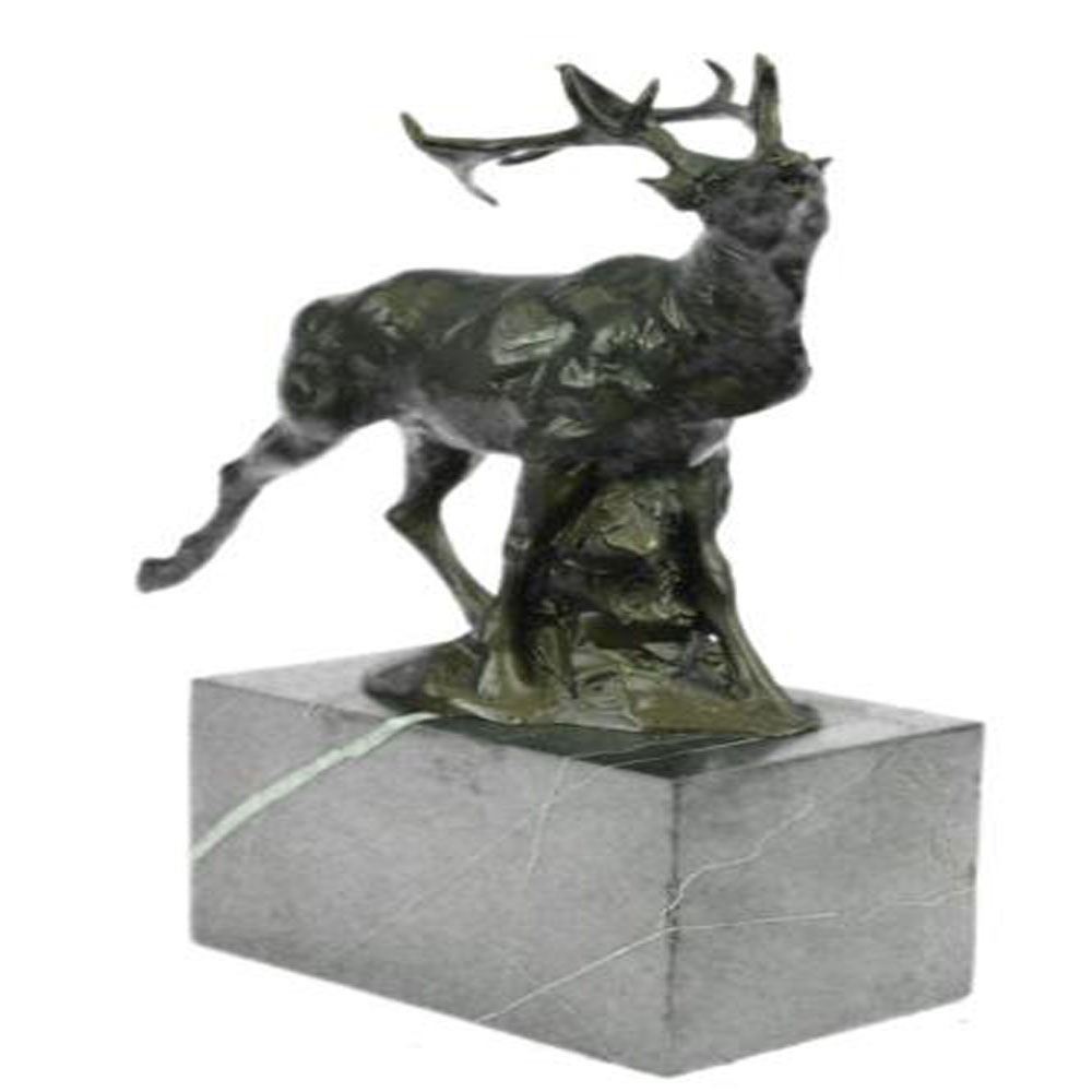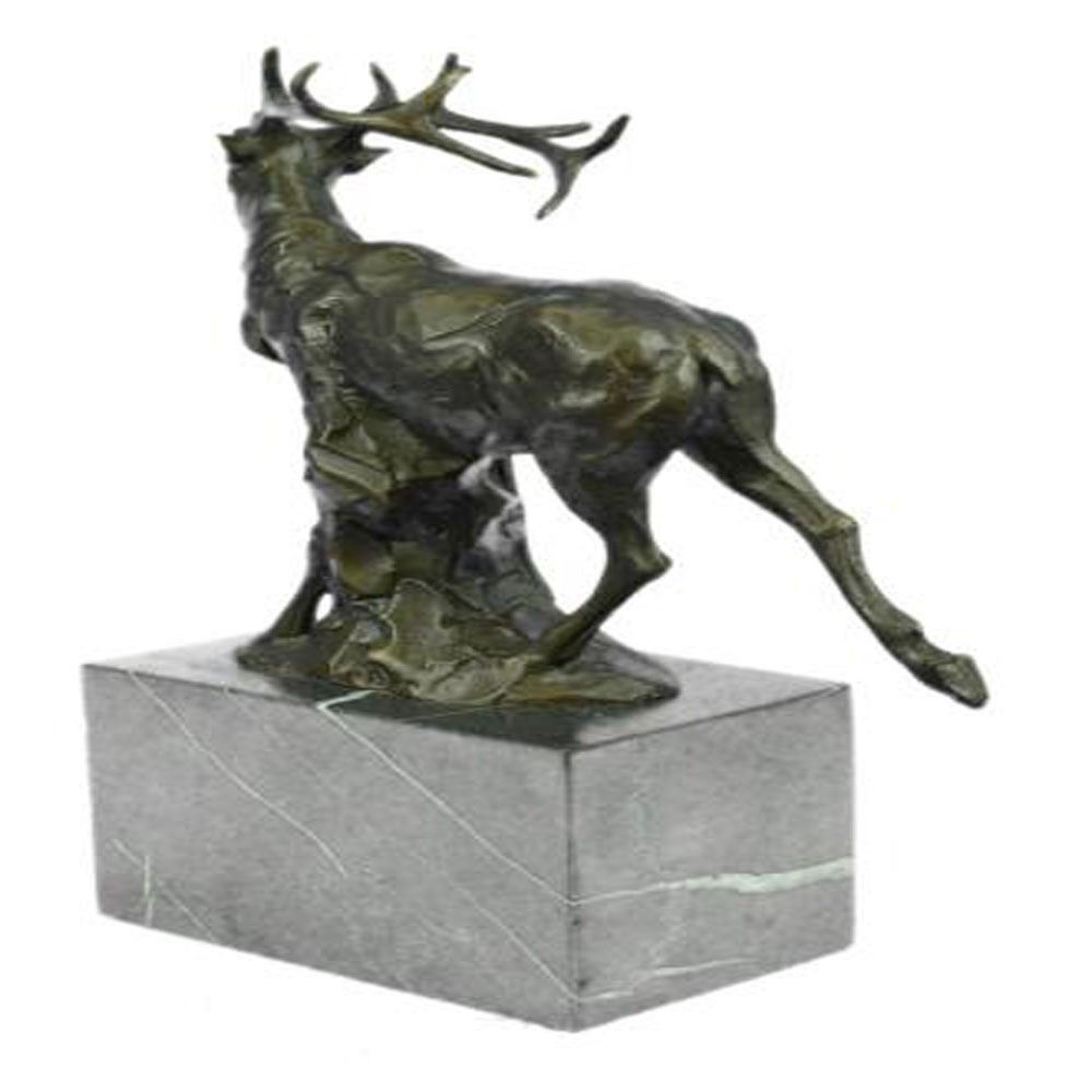 The male deer comes from the edge of the forest offering a series of vocalizations for the mountains to echo across the sky and lands. He seems as though he is on a mission to find a mate. His crown of tall antlers will be used for sparring antler wrestling with another male to gain the rights of dominance and courtship with the desired female. His back left leg is slightly kicked backward as if he is getting ready for anything coming his way. The deer is known for many symbolic meanings such as love, gentleness, kindness, gratefulness, sensitivity, purity of purpose, walking in the light, meditation, longevity, and wealth. The handmade Bronze Sculpture was cast using the age-old method of lost wax casting and stained with a brown patina finish for perpetuation and is mounted upon a marble base. Dimensions: Height 11 X Width 10 inches. Weight: 9 LBS.