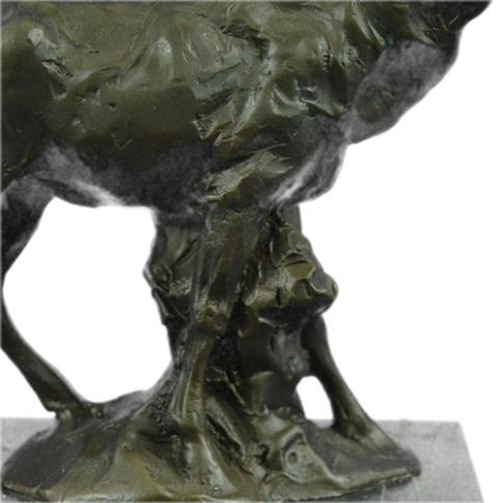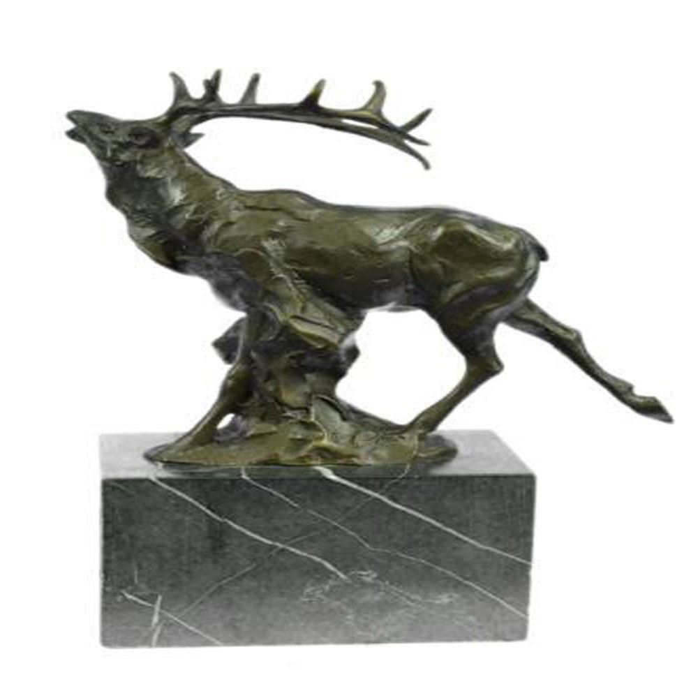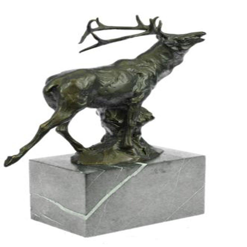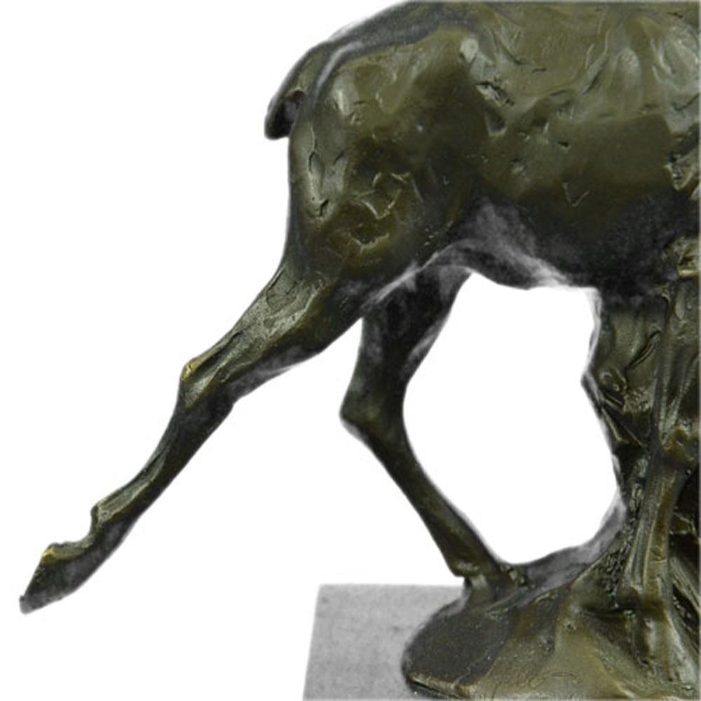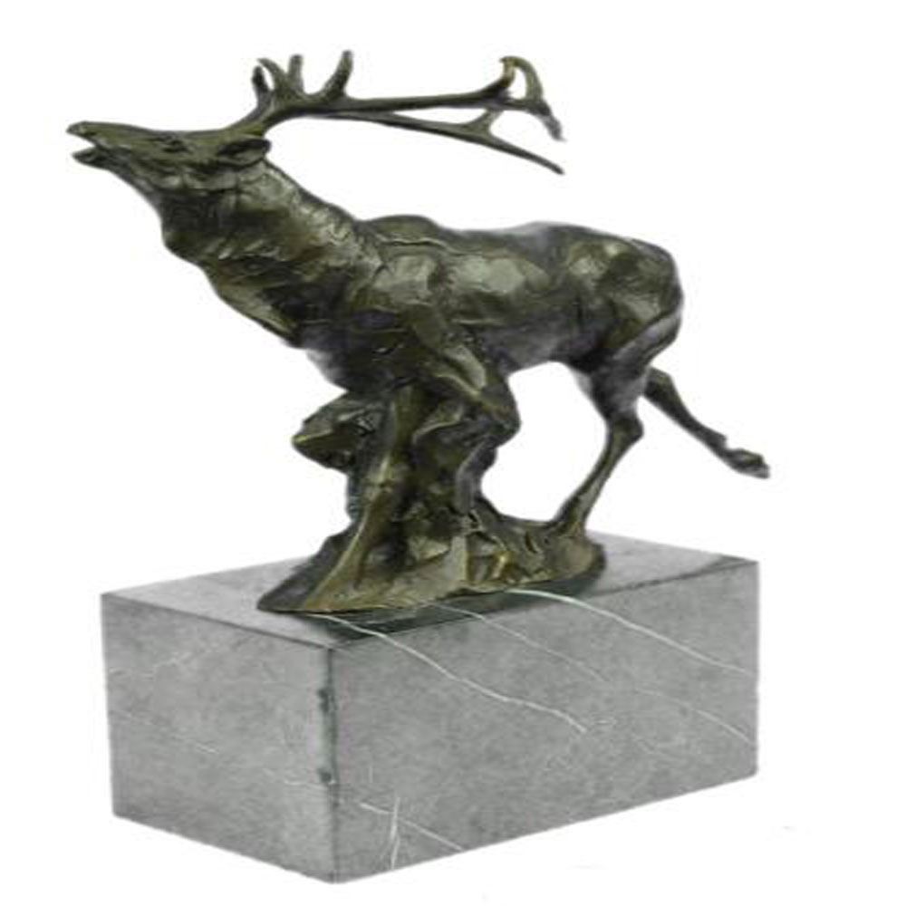The male deer comes from the edge of the forest offering a series of vocalizations for the mountains to echo across the sky and lands. He seems as though he is on a mission to find a mate. His crown of tall antlers will be used for sparring antler wrestling with another male to gain the rights of dominance and courtship with the desired female. His back left leg is slightly kicked backward as if he is getting ready for anything coming his way. The deer is known for many symbolic meanings such as love, gentleness, kindness, gratefulness, sensitivity, purity of purpose, walking in the light, meditation, longevity, and wealth. The handmade Bronze Sculpture was cast using the age-old method of lost wax casting and stained with a brown patina finish for perpetuation and is mounted upon a marble base. Dimensions: Height 11 X Width 10 inches. Weight: 9 LBS.