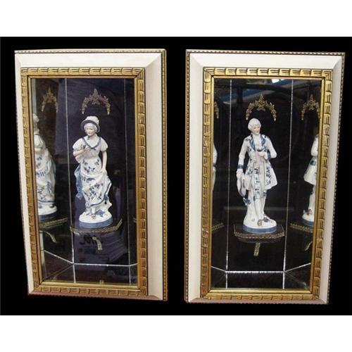 Nice 18th century male & female figures mounted in parcel gilt frame mirror back pedestal shadow box wall plaques.