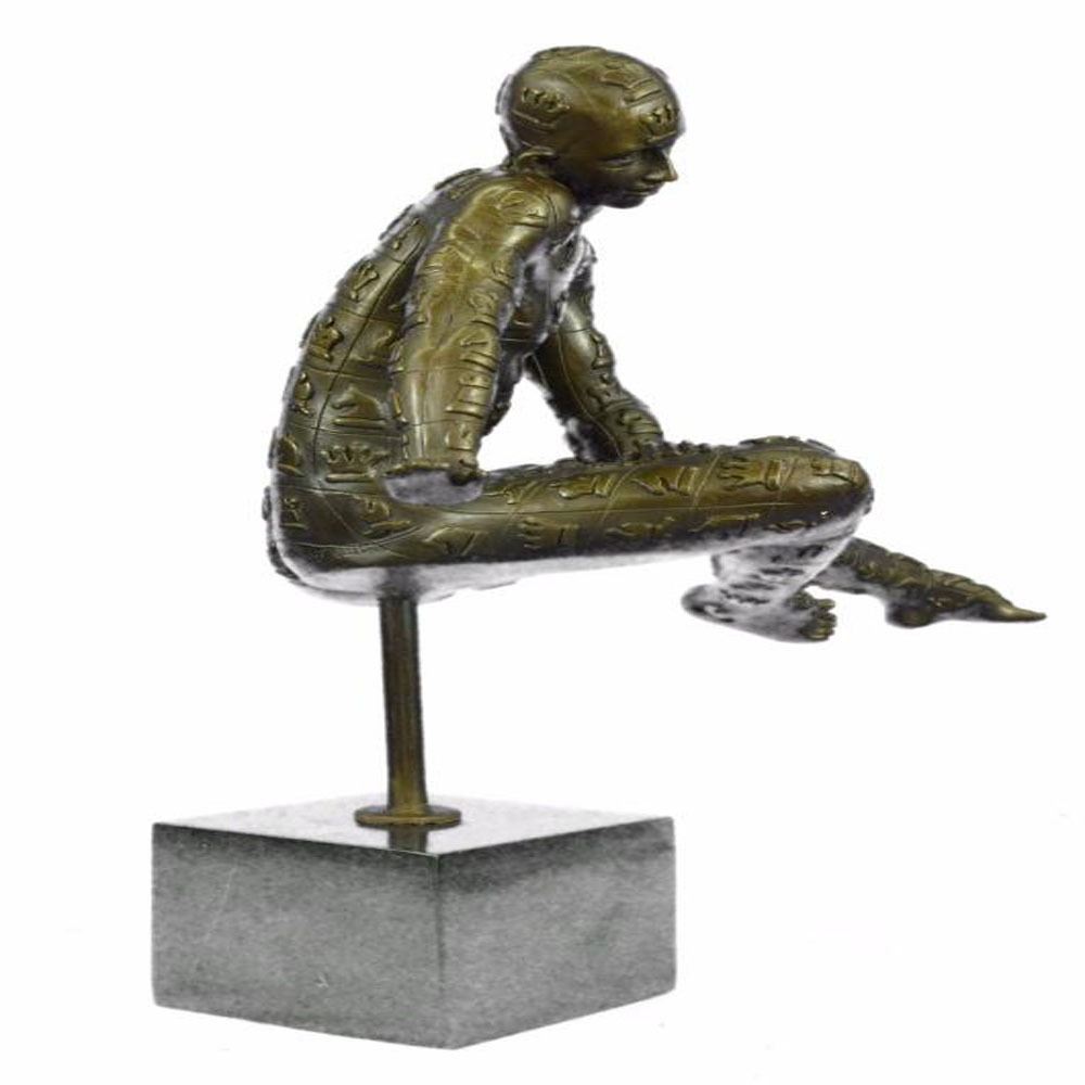 This abstract is a very odd and creative one. Its a figure of a man suspended in air wearing a chess design outfit, but the conversation on it will be mostly about how strange art its working its way through. He has an really fit body and his legs seem to be muscular, as that was the artist intentions. He does seem posing for camera and the rest of his body is made of different little shapes to imagine what your body actually looks like under skin. The Sculpture was cast using the ancient old Lost Wax Method stained in brown patina and mounted atop a marble base. Bronze Dimensions with Marble Base: Height 17 X Width 16 inches. Weight: 20 LBS.