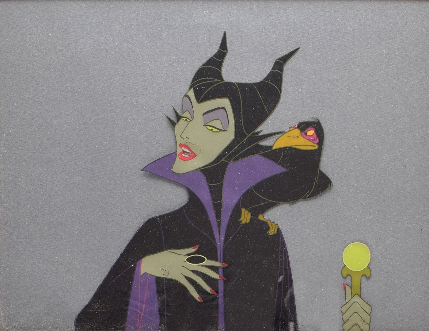 (Walt Disney Studios, 1959) Superb original production cel featuring Maleficent and Diablo from Sleeping Beauty, showing the evil queen in a close-up pose, scepter in hand, with her trusty pet raven perched upon her shoulder. The cel is placed on a solid gray background. Image measures 6 x 6, with a mat opening of 8.75 x 6.75. Attractively framed to an overall size of 16.25 x 14.25. In fine condition, with slight cracking to paint in her mouth and hand.