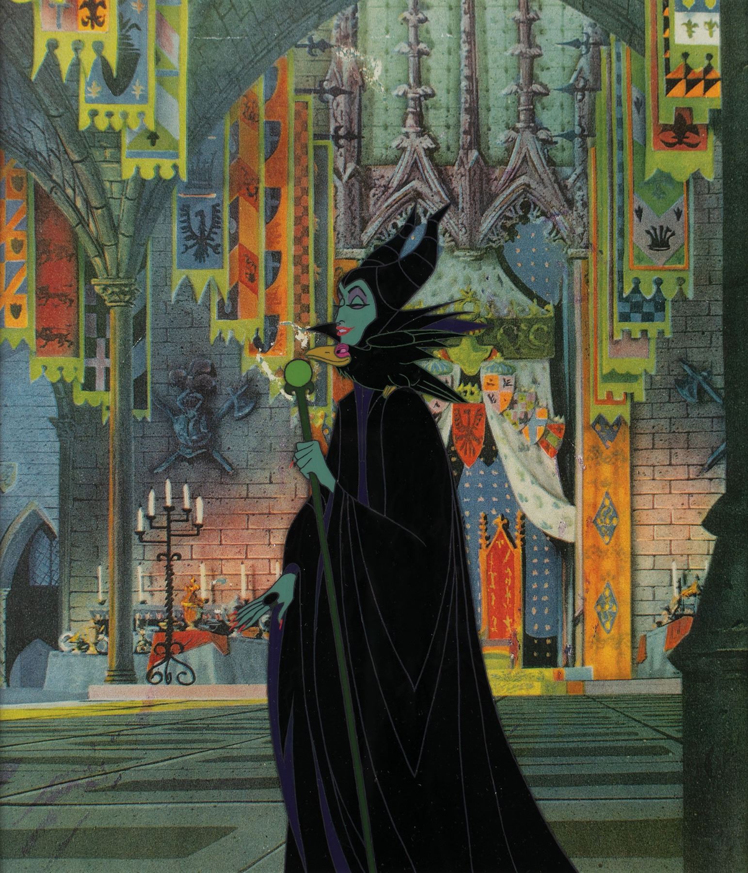 (Walt Disney Studios, 1959) Terrific original production cel of Maleficent and Diablo from Sleeping Beauty, which shows the evil queen in a wonderful three-quarter-length pose, with scepter in hand and her trusty pet raven perched upon her shoulder. The cel is placed on a color copy background from the same film. Full character image measures 4 x 8, with a mat opening of 9 x 10.5. Double-matted and framed to an overall size of 16.5 x 18. In fine condition. A fiendishly attractive production cel of the powerful sorceress and her beloved pet raven.
