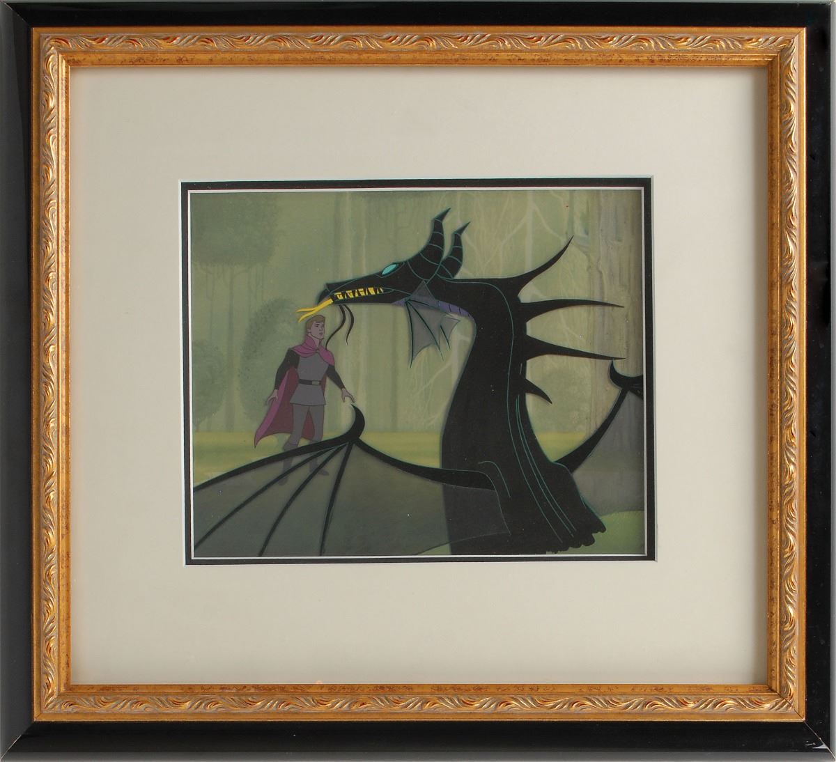 (Walt Disney Studios, 1959) Stupendous original production cels featuring Maleficent and Prince Phillip from Sleeping Beauty, showing the valiant prince confronting the wicked dragon in the forest. The cels are placed on a Disney litho background. Character images measure 2.25 x 4 and 10.5 x 8, with a mat opening of 10.5 x 8.5. This piece is also framed to an overall size of 19.5 x 18. In fine condition. A brilliant and dramatic set-up.