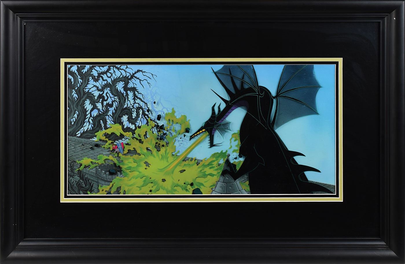 (Walt Disney Studios, 1959) Extraordinary original matching production cels with special effects featuring Maleficent and Prince Phillip from Sleeping Beauty, showing the Prince, armed with the Sword of Truth and Shield of Virtue, as he defeats Maleficent in her fire-breathing dragon form during their battle at the climax of the film. The cels are placed on a hand-painted custom prepared background made by a Disney artist from the original matching drawings; this was done for his personal collection circa 1995. Image measures 20 x 10, with a mat opening of 20.5 x 10. Framed to an overall size of 31 x 20. In fine condition. An incredibly rare, one-of-a-kind piece.