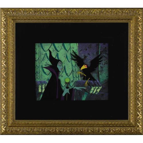 <B>Maleficent and the Raven "Sleeping Beauty" Production Cel with Presentation Background Original Art (Walt Disney, 1959).</B></I> Eerie green, black, and violet hues set the perfect mood for this chilling portrait of Maleficent. Image area of 10.5" x 8.5". Framed and in Excellent condition.