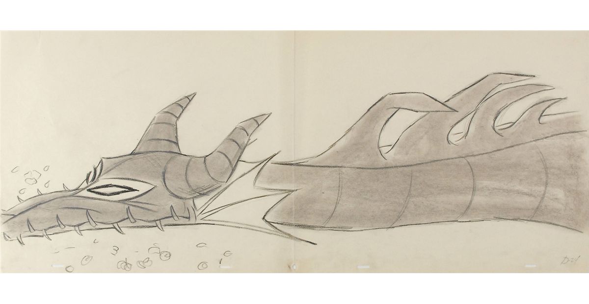 (Walt Disney Studios, 1959) Original ‘rough’ pan production drawing featuring Maleficent as the Dragon from Sleeping Beauty. Accomplished in crayon, pastel, and charcoal on untrimmed 30 x 12.5 animation paper. Huge image measures 30 x 8 and is of Maleficent, in the form of the fire-breathing dragon, after she has crashed to the ground dead. In fine condition, with a central vertical fold. A huge full cinemascope drawing of one of Disney’s most impressive movie creations.