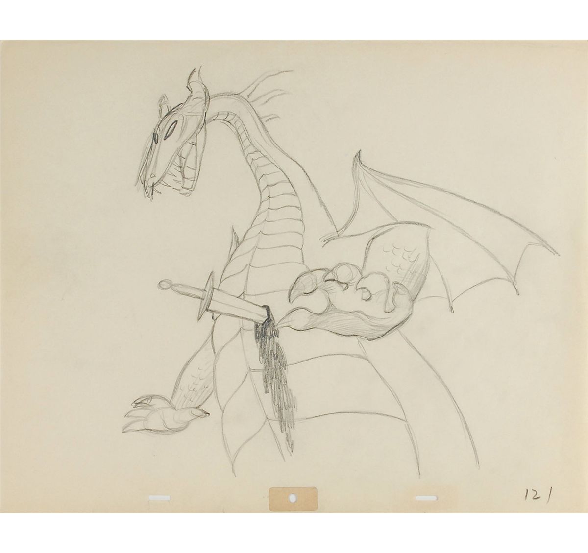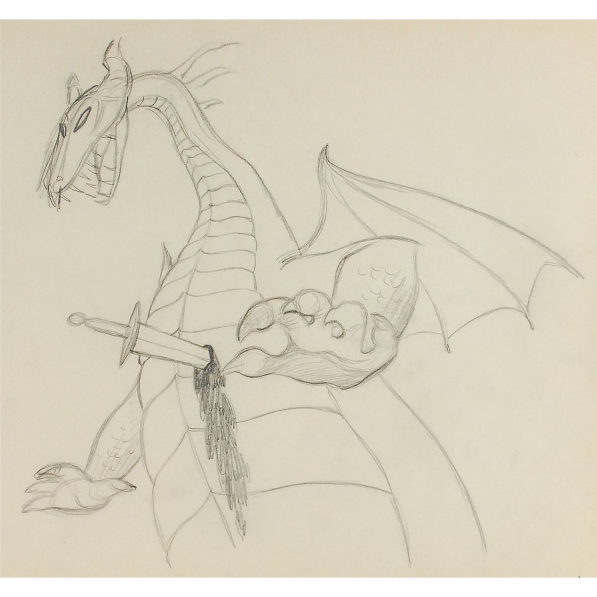 (Walt Disney Studios, 1959) Original ‘rough’ production drawing featuring Maleficent as the Dragon from Sleeping Beauty. Accomplished in graphite on untrimmed 15.5 x 12.5 animation paper. Image measures 11.5 x 11 and shows the dragon pierced with Prince Phillip’s ‘sword of truth’ at the climax of the film. In fine condition.