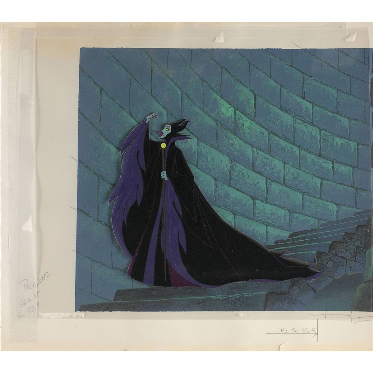(Walt Disney Studios, 1959) Original cut-out production cel placed on a partial production background featuring Maleficent from Sleeping Beauty, showing the villain in her castle angrily shaking her fist in the air. The cel is trimmed to image and placed on a non-matching partial hand-painted production background. Character image measures 7.75 x 6.25 and hand-painted background measures 10.5 x 9.5, with overall dimensions of 13.25 x 12. In fine condition. A highly desirable pairing of an original production background with a fantastic image of Maleficent.