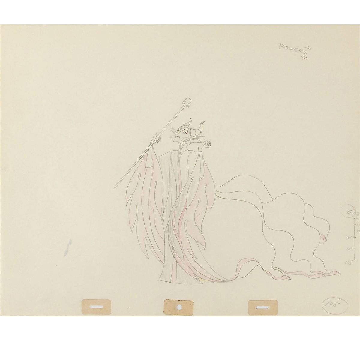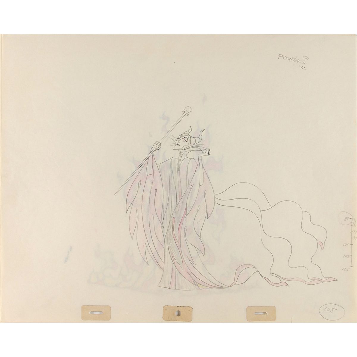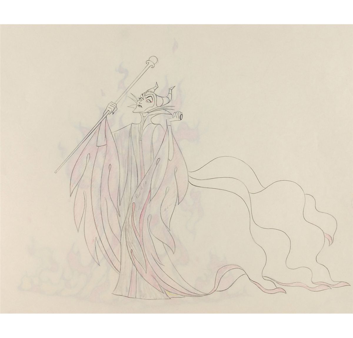 (Walt Disney Studios, 1959) Original matching set of production drawings featuring Maleficent and her shroud of fire from Sleeping Beauty. Accomplished in graphite and colored pencil on two sheets of untrimmed 15.5 x 12.5 animation paper. Images measure 9 x 8. In fine condition. These drawings were for the scene at the climax of the film when Maleficent yelled, ‘Now shall you deal with me, o Prince…and all the powers of Hell!,’ before busting into flames and turning into a dragon. An excellent matching pair from a memorable moment starring the recognizable Disney villain.