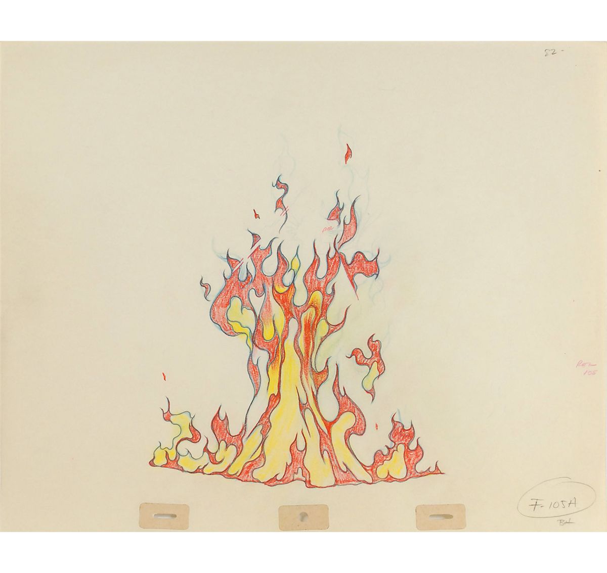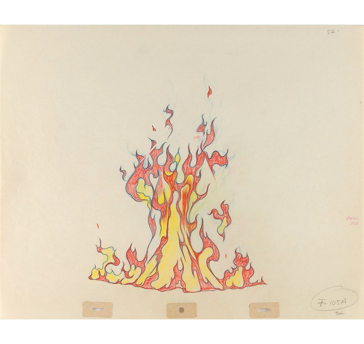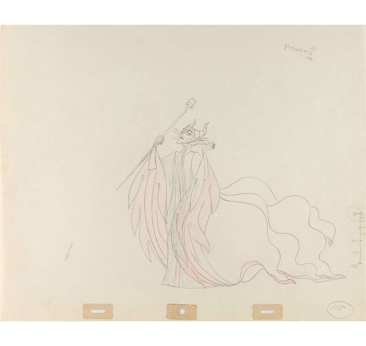 (Walt Disney Studios, 1959) Original matching set of production drawings featuring Maleficent and her shroud of fire from Sleeping Beauty. Accomplished in graphite and colored pencil on two sheets of untrimmed 15.5 x 12.5 animation paper. Images measure 9 x 8. In fine condition. These drawings were for the scene at the climax of the film when Maleficent yelled, ‘Now shall you deal with me, o Prince…and all the powers of Hell!,’ before busting into flames and turning into a dragon. An excellent matching pair from a memorable moment starring the recognizable Disney villain.