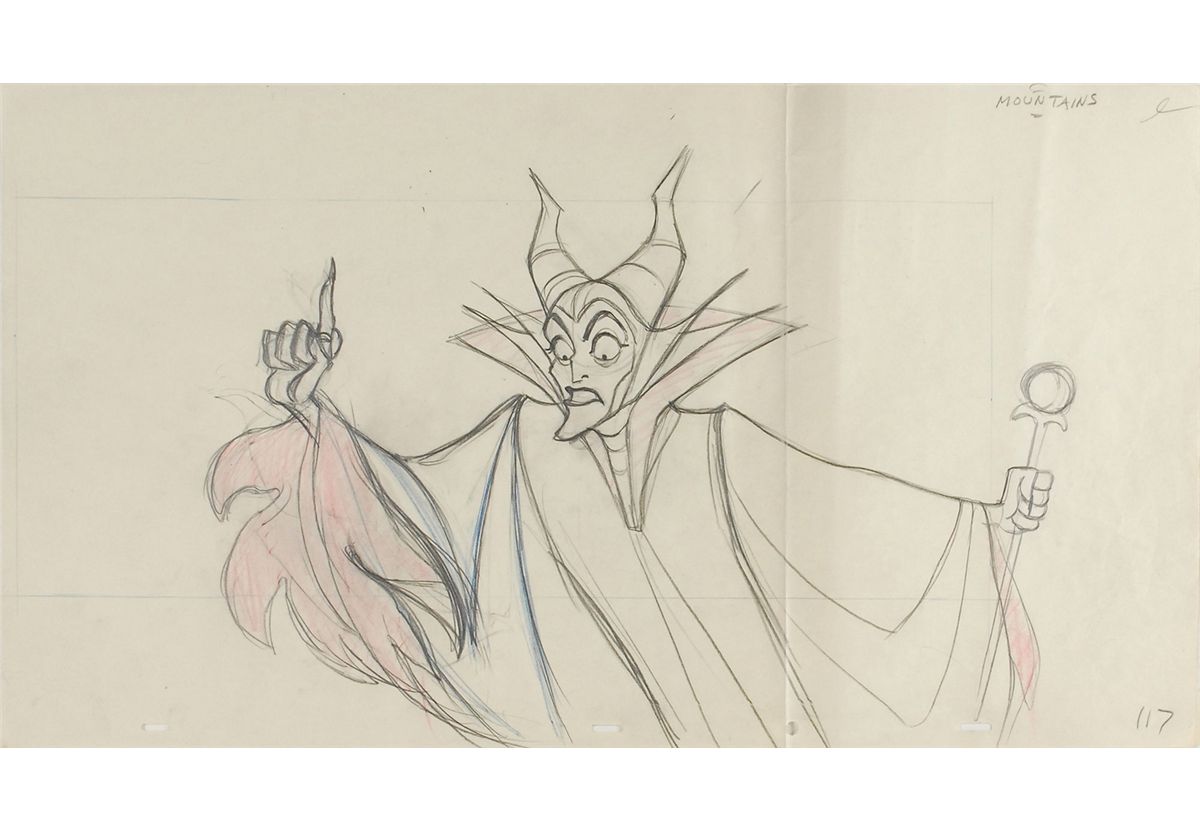 (Walt Disney Studios, 1959) Original pan production drawing featuring Maleficent from Sleeping Beauty. Accomplished in graphite on untrimmed 22.5 x 12.5 animation paper. The panoramic portrait pose of the irate Maleficent yelling at her unseen goons measures 16 x 11.5. In fine condition, with a vertical fold to right side.