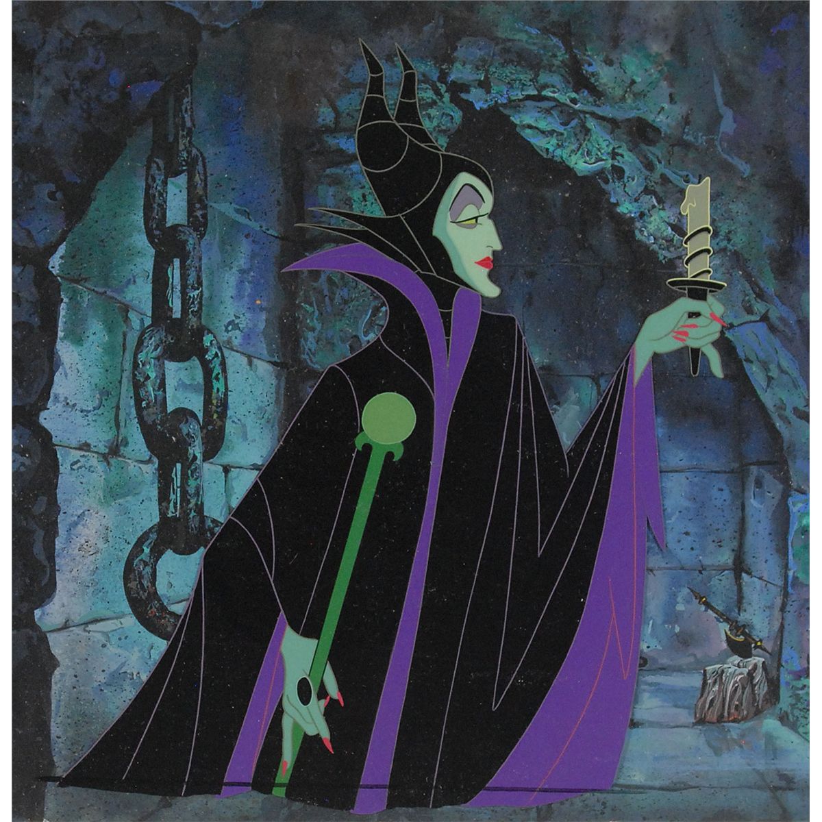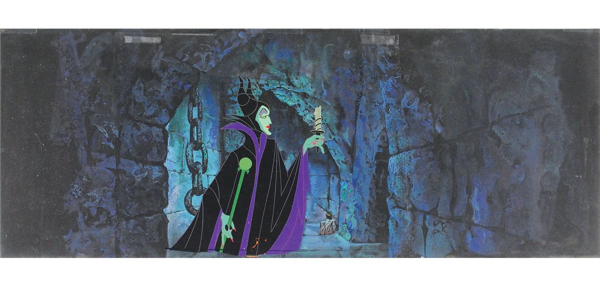 (Walt Disney Studios, 1959) Original production cel and pan production background featuring Maleficent from Sleeping Beauty, showing her in a prominent half-length pose holding a candle. The cel is placed on an exquisite hand-painted pan production background of a spooky dungeon-like room in Maleficent’s castle. Maleficent measures 7 x 9 and hand-painted background measures 30 x 11.5, with overall dimensions of 32 x 12. In fine condition. An exceptionally desirable piece.