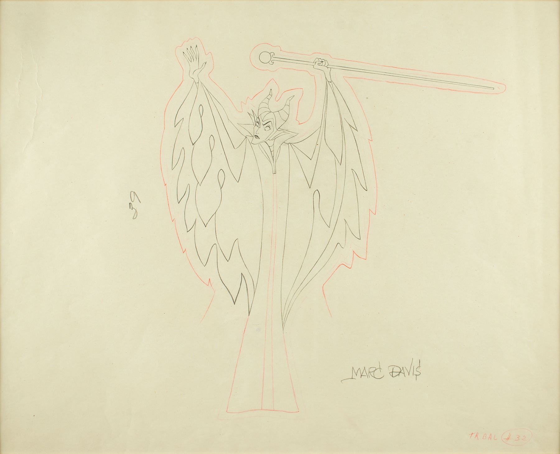 (Walt Disney Studios, 1959) Wonderful original production drawing of Maleficent from Sleeping Beauty, which is signed by master animator Marc Davis. The drawing shows the evil sorceress displaying her awful power, with her raised arms and the design and flow of her cloak indicating a state of transformation. Accomplished in graphite and colored pencil on untrimmed 14 x 11.25 animation paper, which is marked "TRBAL #32" in the lower right corner. Image measures 8.5 x 9. Double-matted and framed to an overall size of 21.25 x 19. In fine condition.