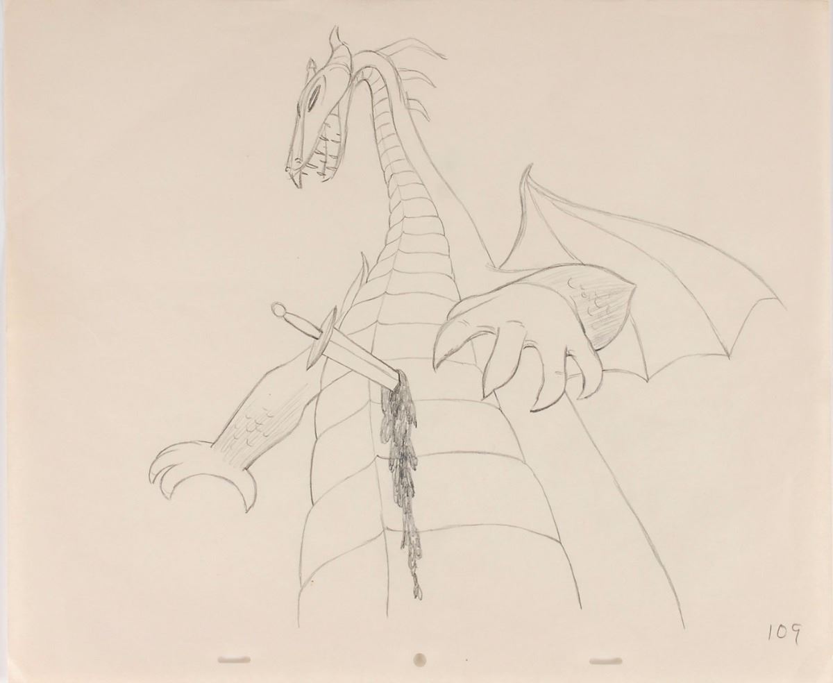 (Walt Disney Studios, 1959) Original production drawing featuring Maleficent from Sleeping Beauty, showing her in dragon form as she is slain by Prince Phillip’s ‘Sword of Truth.’ Accomplished in graphite on untrimmed 15.5 x 12.5 animation paper. Image measures 12 x 11. In fine condition. A great action-packed drawing.