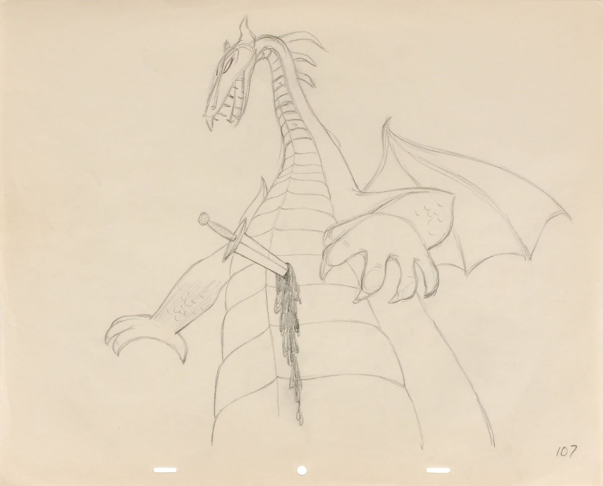 (Walt Disney Studios, 1959) Original production drawing of Maleficent as a dragon from Sleeping Beauty, depicting the towering beast fatally pierced with the ‘sword of truth.’ Accomplished in graphite on untrimmed 15.5 x 12.5 animation paper. Image measures 12 x 11. In fine condition.