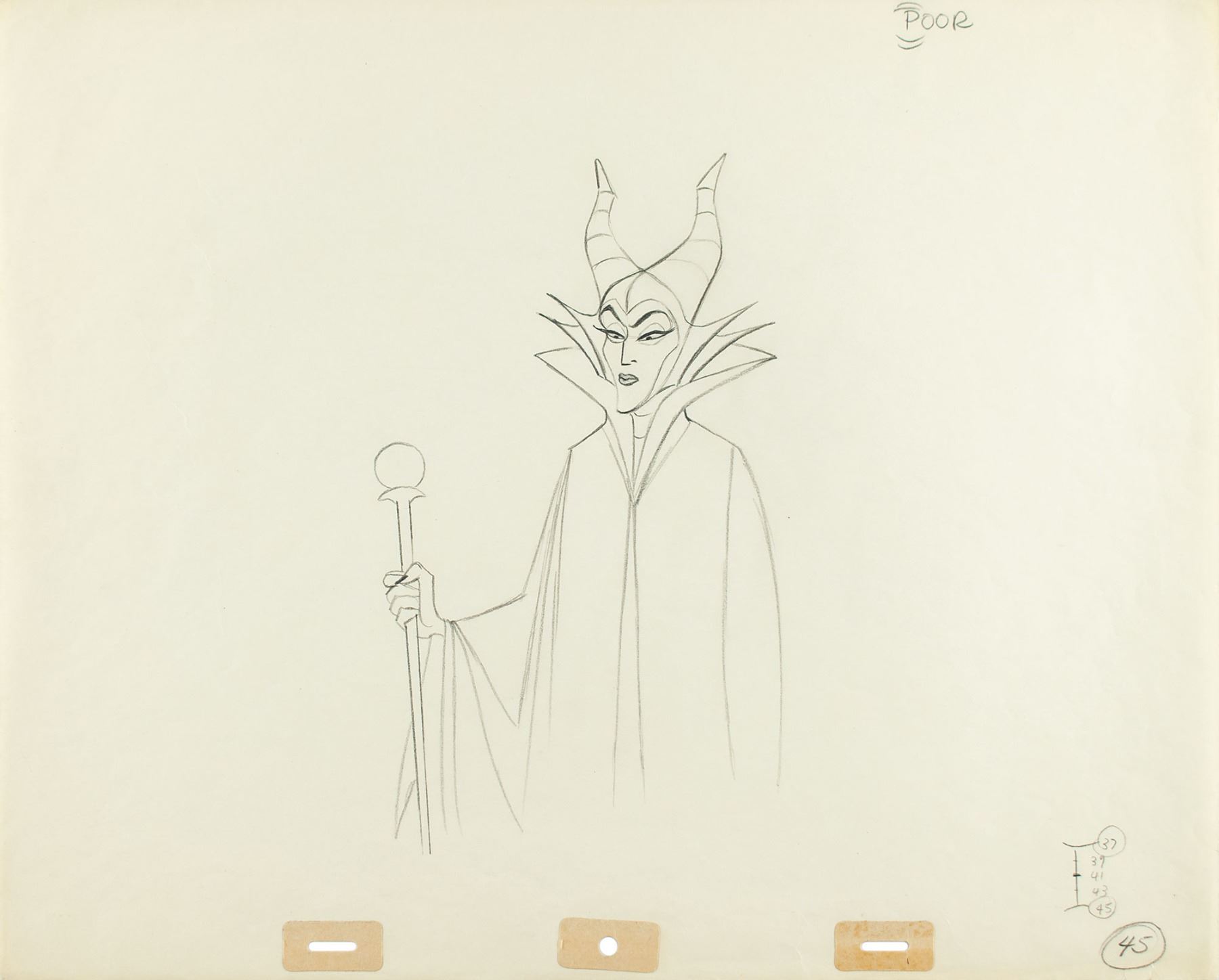 (Walt Disney Studios, 1959) Original production drawing of Maleficent from Sleeping Beauty, showing the evil sorceress, her scepter in hand, in an entirely displeased half-length pose. Accomplished in graphite on untrimmed 15.5 x 12.5 animation paper, which is marked "45" in the lower right. The character image measures an impressive 5 x 8.25. In fine condition.