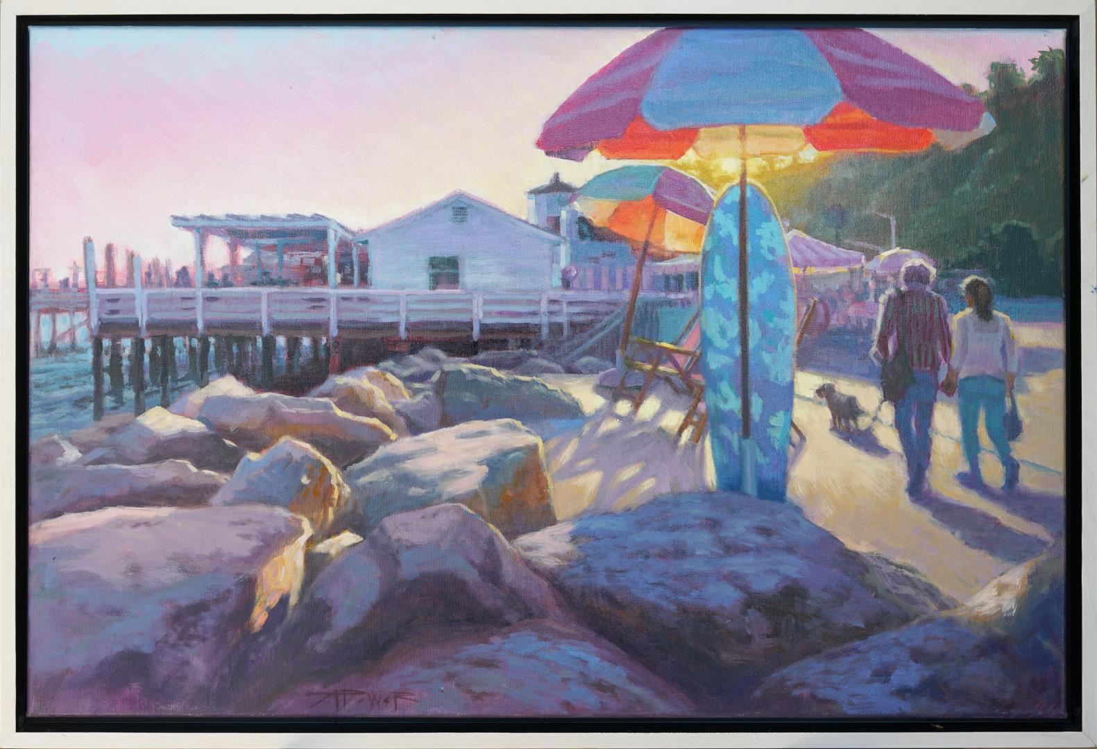 Original Painting exhibited at the Hilbert Museum of Art, of the famous Malibu Pier at dusk in this 20x30 oil on wrapped canvas by Anette Power; in a floater frame at 22x32, with artist's COA