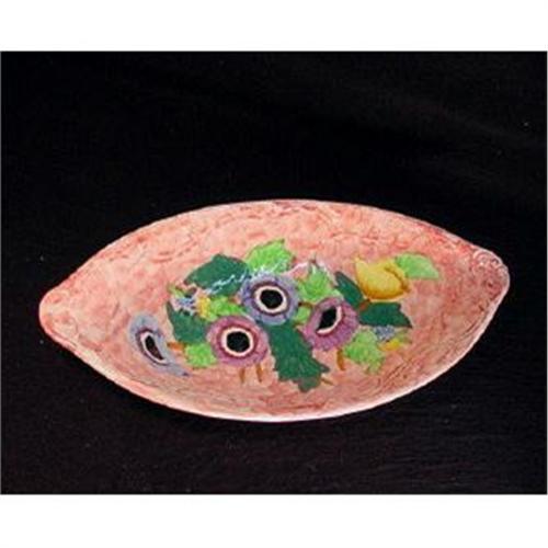 Boat-shaped Maling dish, pink thumbprint pattern with Anemone flowers decoration.