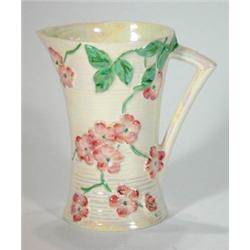 Maling jug with angular handle, hand painted with sprigs of flowers onto an iridescent ground, marks to base, 22cm high