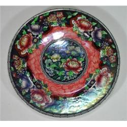Maling plate hand coloured and transfer printed with panels of flowers and a butterfly onto a pink iridescent ground, printed and impressed mark to back, 30cm diameter