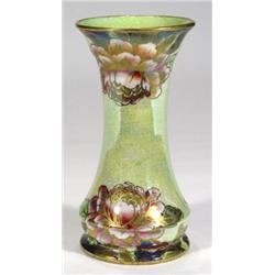 Maling pottery vase, hand coloured and transfer printed with flowers onto a mottled green lustre ground, printed marks and painted 5785 to base, 21cm high