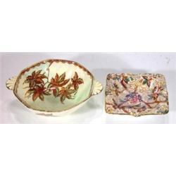 Maling vase hand coloured and transfer printed with a band of flowers onto a blue ground, a twin handled bowl decorated with golden spray and a floral ashtray, marks to bases, largest 18cm in length