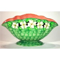 Maling vase with fluted rim hand painted and tubelined with white flowers onto a green ground with pink interior, marks to base, 17cm high