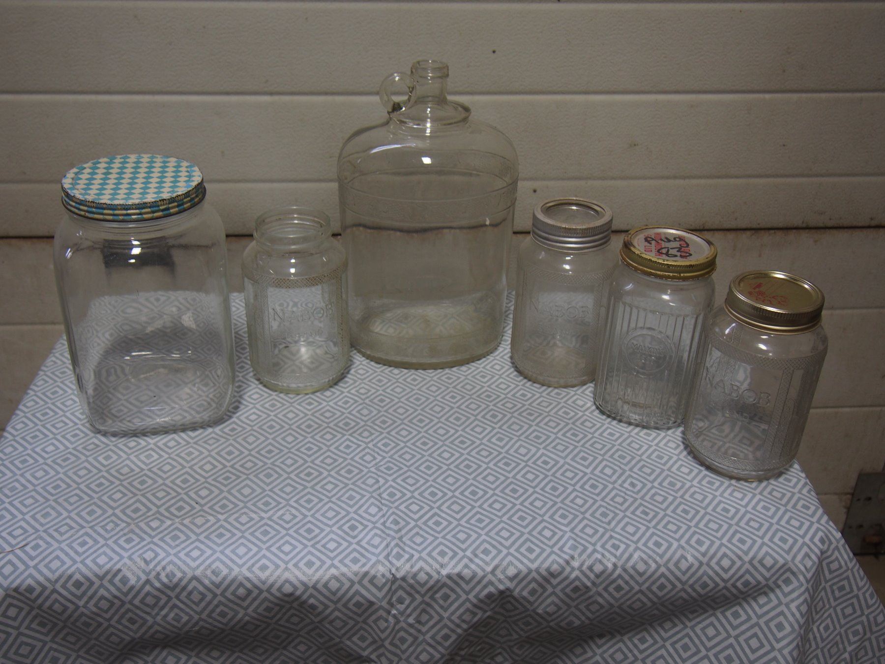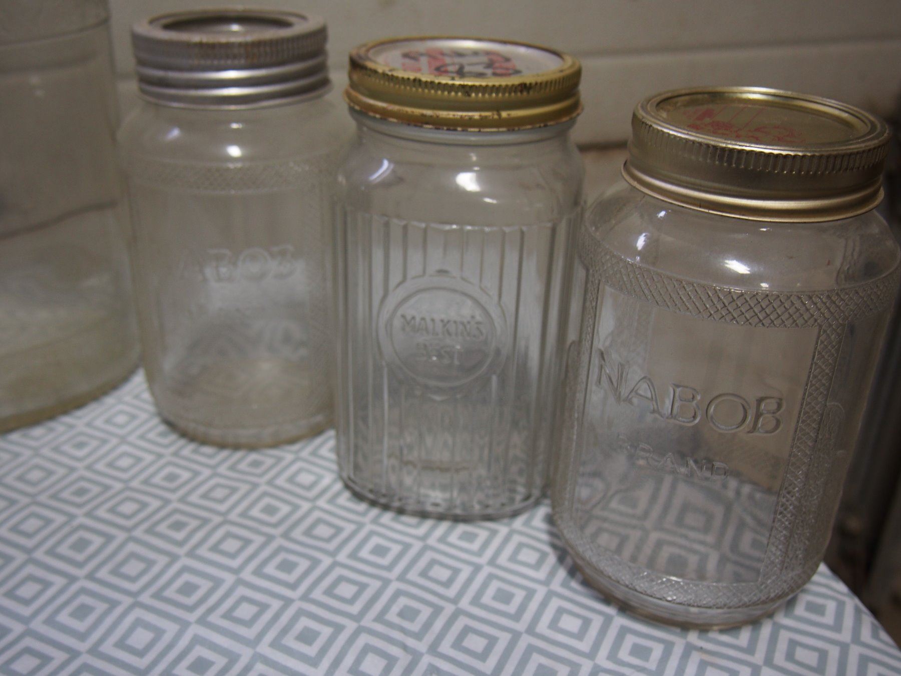 Malkin's Best Coffee Jar, 3 Nabob Coffee Jars and Whiskey Jars