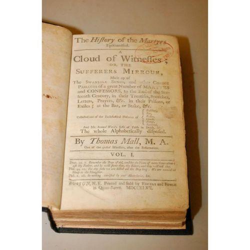 Mall, Thomas. The History of the Martyrs Epitomised. A Cloud of Witnesses; or, the Sufferers Mirrour....- 2 Volumes in 1. Boston: Rogers and Fowle, 1747. First American Edition. 8vo - over 7¾" - 9¾" tall. Hard Cover. Ex-Library. In Very Good Condition. [16] 267pp, [2]; [4] xi [1] 292pp, [4]. Bound in black pebbled cloth (library binding), with binding & hinges tight. Title continues: Made up of The Swanlike Songs, and Other Choice Passages of a Great Number of Martyrs and Confessors, to the End of the Sixteenth Century, in their Treatises, Speeches, Letters, Prayers, &c. in their Prisons, or Exiles; at the Bar, or Stake &c.