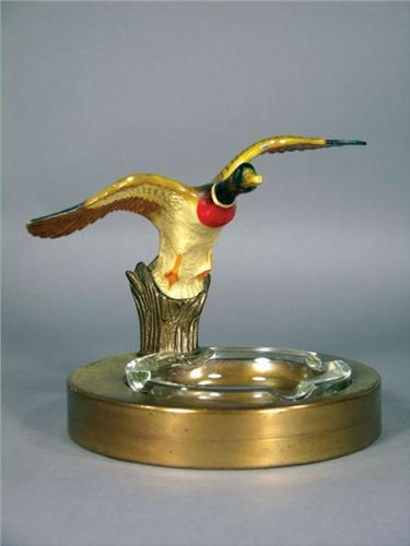 Mallard Duck Ash Tray, metal with glass insert. 6 3/4 inches tall.