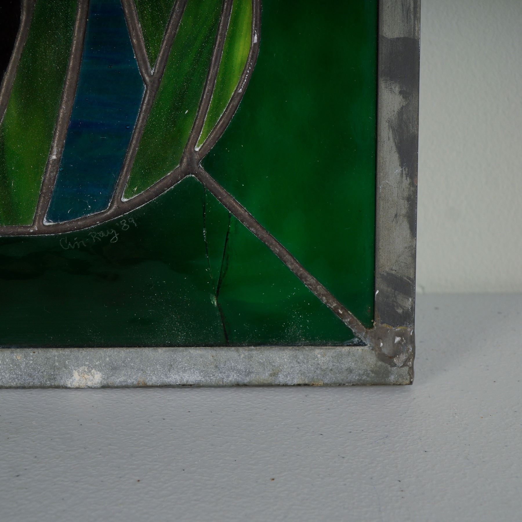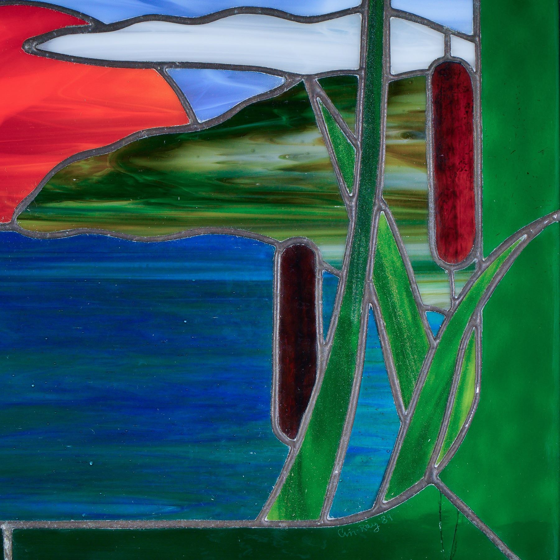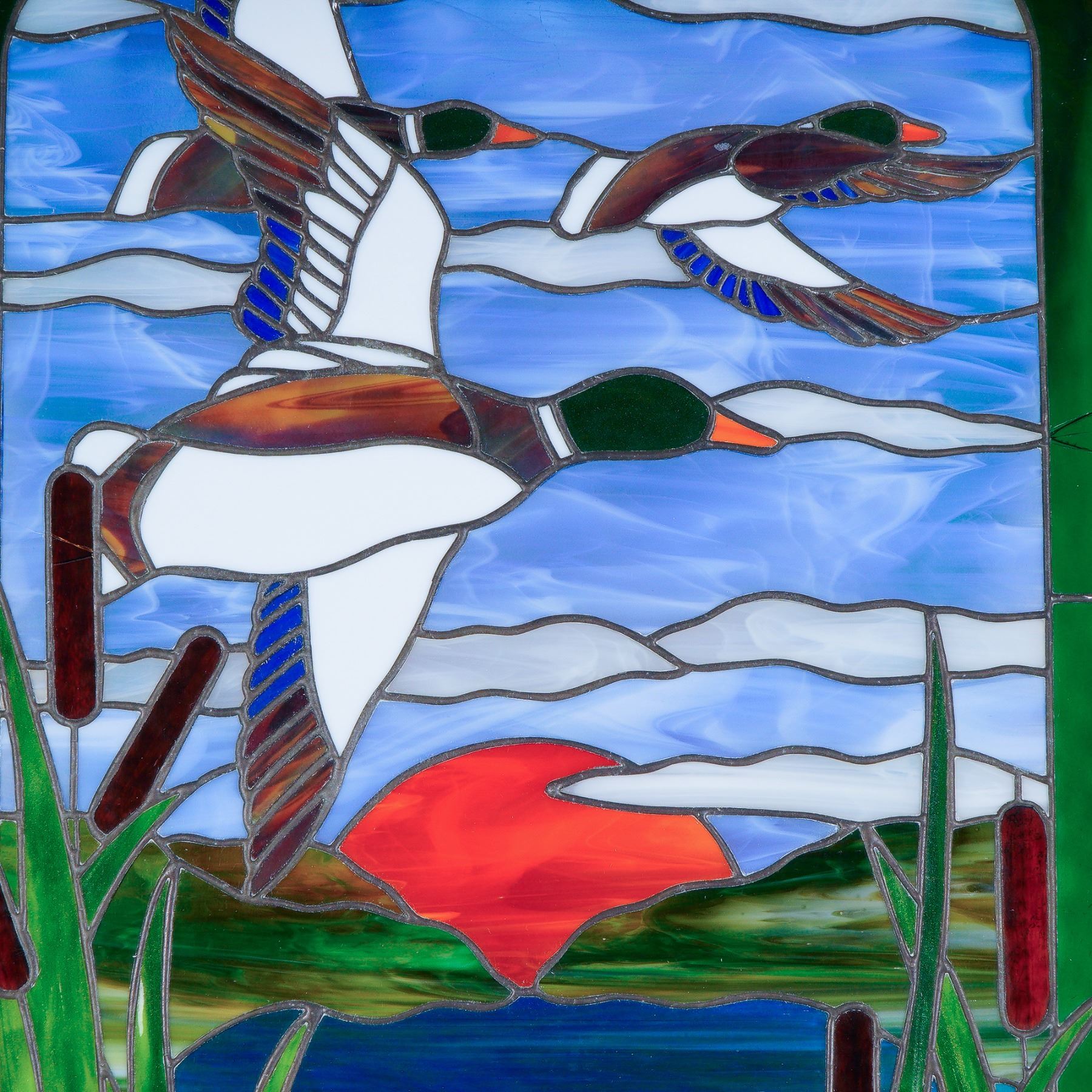 A vibrant and striking stained glass panel depicting mallard ducks in flight against a brilliant sky, with cattails in the foreground and a glowing red sun setting over distant green hills. The artist's masterful use of richly hued glass brings the scene to life, with the iridescent blues of the sky and water contrasting beautifully against the earthy tones of the birds and reeds. The composition captures both movement and serenity, making it a remarkable display of craftsmanship. Signed and dated lower right Ray 89, this piece reflects the timeless artistry of late 20th-century stained glass work. Framed in sturdy lead came with dual hanging loops at the top, it is ready for display in a window where natural light will animate its luminous colors.