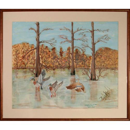 Brenda Sue Kerster?s original watercolor painting entitled, ?Mallards in Flight? is a charming illustration of three ducks about to land in a flooded marsh. Autumn has overtaken the land as the trees in the middle ground stand barren and the trees in the background are gold and orange with turning leaves. The ducks were rendered with fine details as each feather is articulated. The piece is surrounded by an off-white mat and mounted in a thin, medium oak wood frame that accentuates the trees within the composition. The unique matting and framing presentation of this piece was individually selected and created by Le Chateau?s renowned master framer, Jeanette Shoenrock, and bears her signature on the back. It is signed in the lower right and dated by the artist. Including the lovely frame, this piece measures 32?x 26 ½? and would be a wonderful and affordable addition to any collection of landscape watercolors.