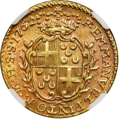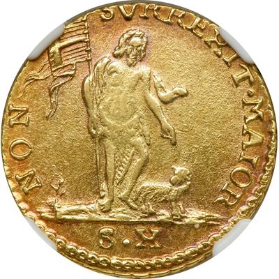 Malta. 10 Scudi, 1762. Fr-36; KM-270. Emanuel Pinto, 1741-1773. Crowned arms. Reverse: St. John standing. In a new NGC 4 prong holder. NGC graded AU-55.