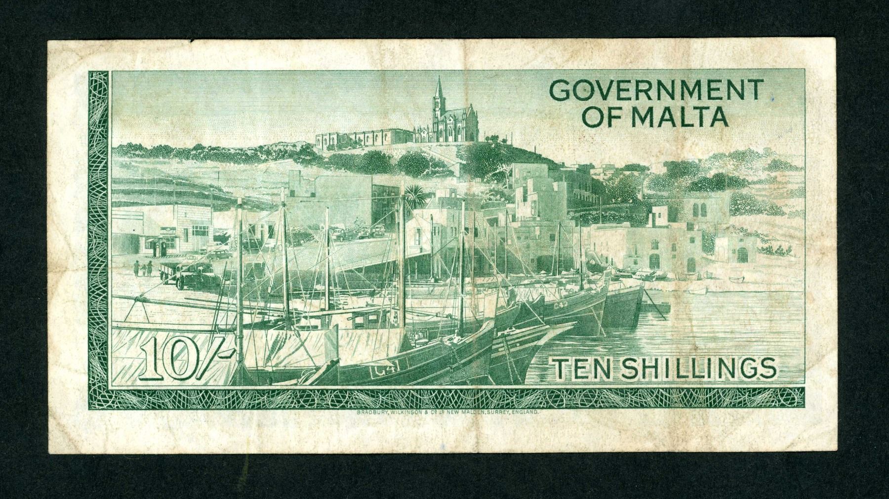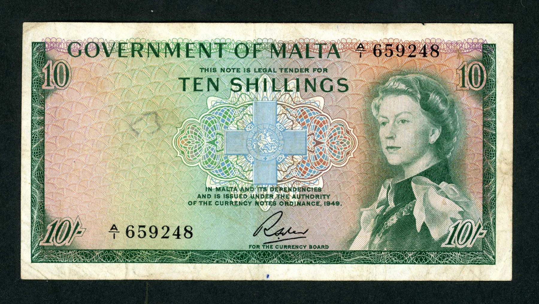 Malta 10 Shillings 1949 (1963), P-25a Banknote Very Fine +