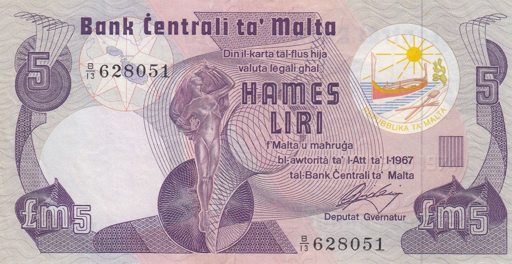 Malta, 5 Liri, 1979, XF, p35br/serial number: B/13 628051
