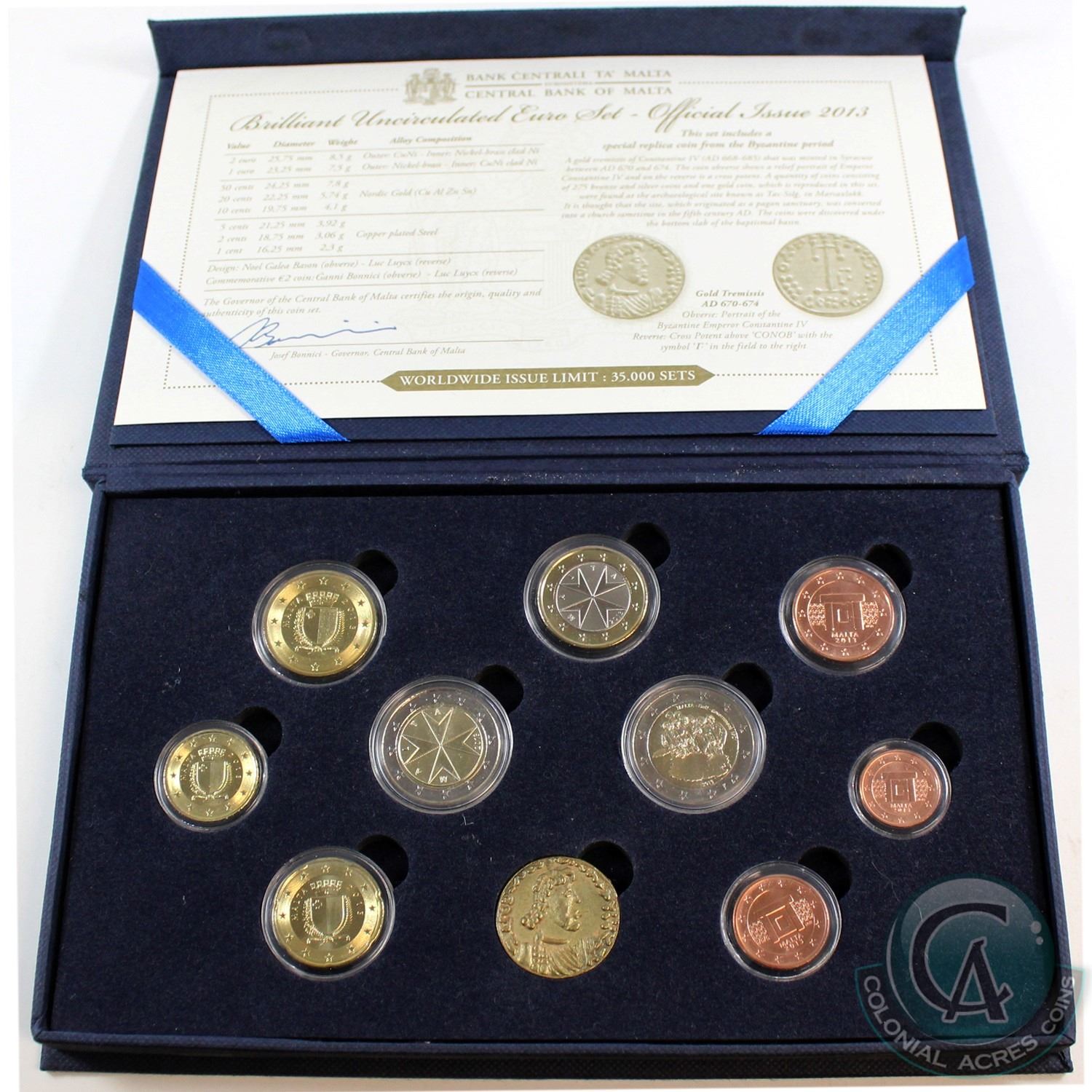 Malta Issue: Brilliant Uncirculated 9-coin Euro Set with Byzantine Period Replica Coin Issued by the Central Bank of Malta. Comes with all original Issued Packaging and COA.