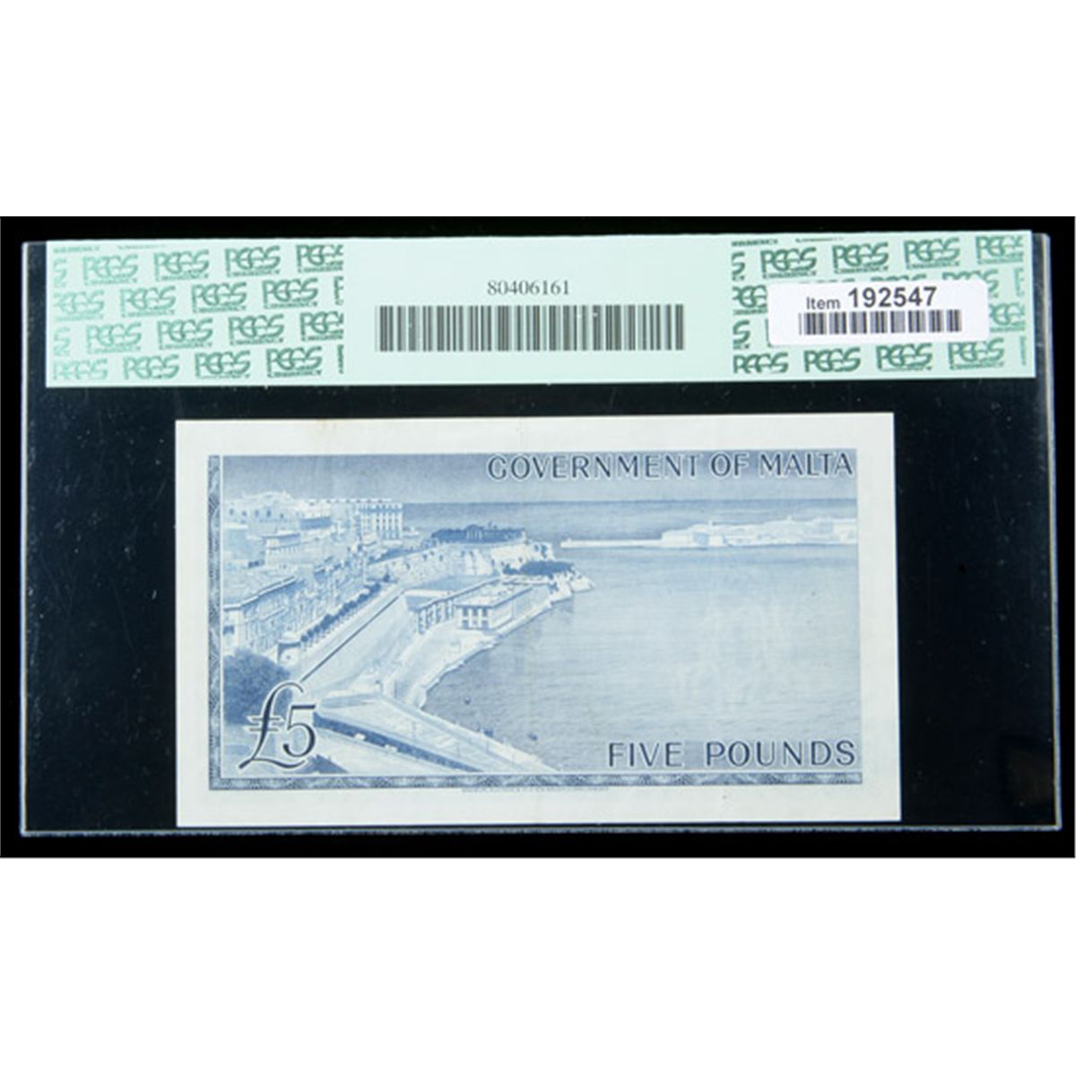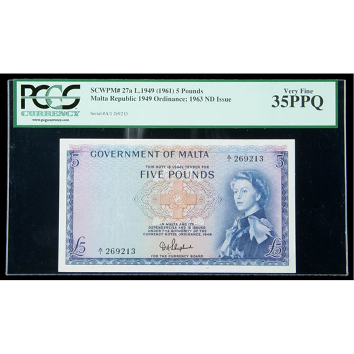 Malta SCWPM# 27a, L.1949 (1961) 5 Pounds. PCGS Very Fine 35PPQ. . Fr-P-27a. This is a surprisingly scarce QE2 era note, especially in higher grades. Neither of the major grading services has graded a single example in uncirculated grades.