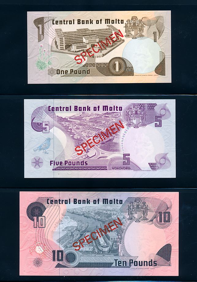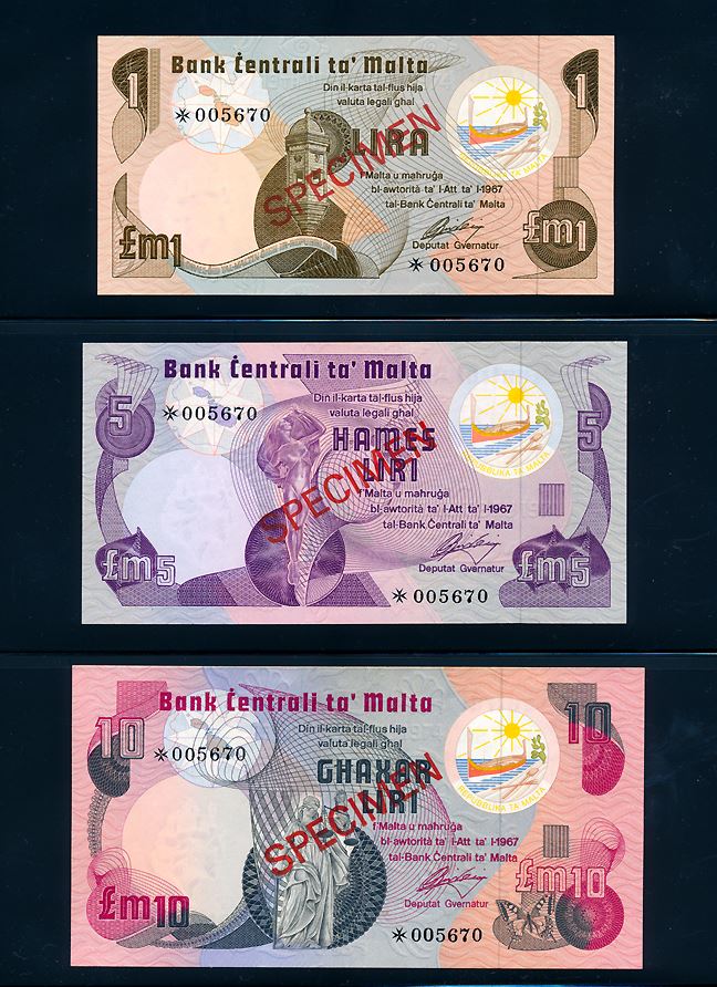 Malta, Specimen banknote set, 1, 5, 10 Liri, 1979, as P.34-36, P.CS1, all Unc. Total 3 notes.