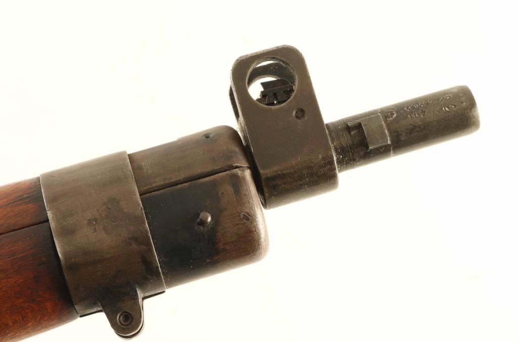British military bolt action rifle. Features 25" barrel, bayonet lug, blade front sight with protector ears, receiver mounted peep rear sight with flip up elevator ladder, sling swivels, 10 round detachable magazine, stripper clip bridge, manual safety, trap door in butt. Bore is poor to fair condition, dark and evenly corroded in appearance with strong rifling. Metal surfaces show a mottled appearance with grayish tan colored metal throughout and some remnants of black paint. Stock is good condition, lightly sanded, with replacement piece repair visible at heel. Includes good condition tan colored cotton web sling. Safety can be partially engaged which allows cocking piece to move slightly forward when trigger is pulled, requiring manual re-cocking to allow bolt to operate. Condition is NRA Fair - mechanical problem needs repair *** C&R Firearm ***