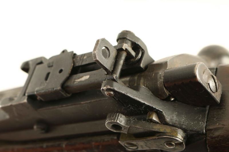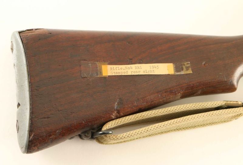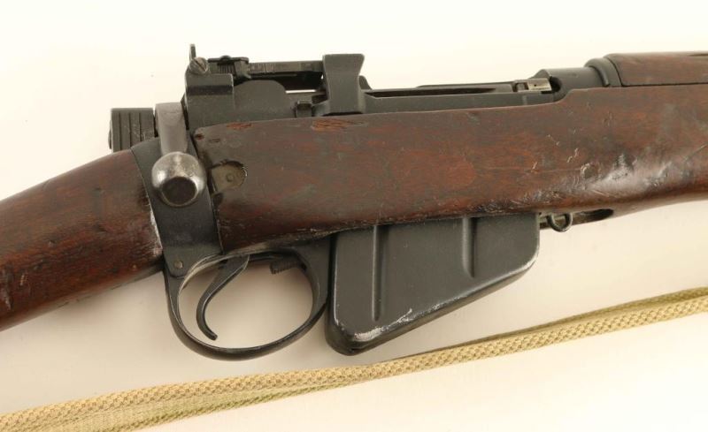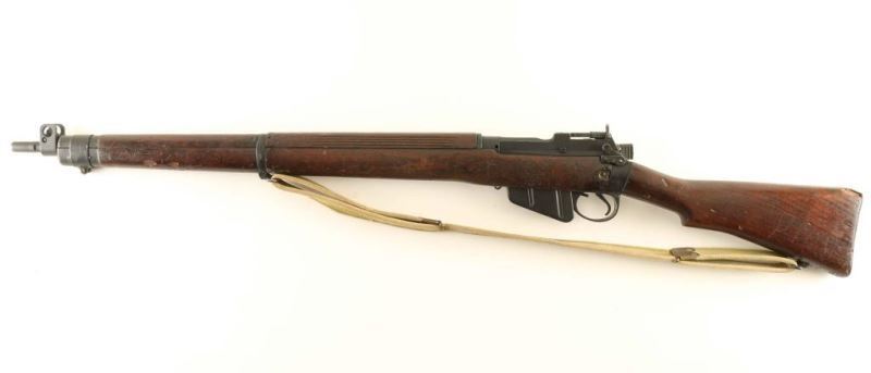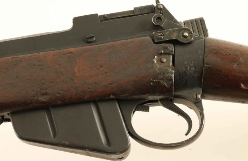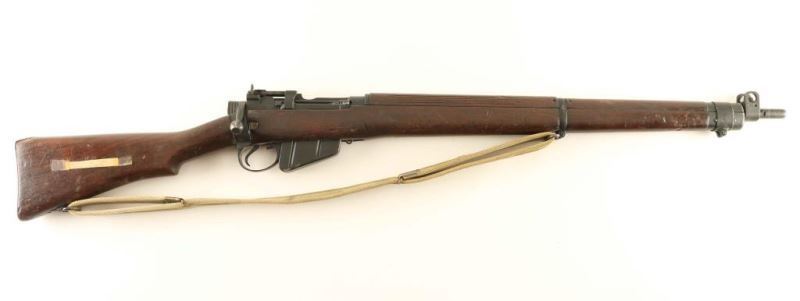 British military magazine fed bolt action service rifle chambered in .303 British, manufactured circa 1945. Features a matte black finish, 25.2" barrel with integral bayonet lugs, shrouded patridge front sight, stamped metal flip-up aperture rear sight graduated to 1,300 yards , two barrel bands, smooth trigger, detachable 10 round magazine, manual safety on the left side of the receiver, canvas sling, integral charge loading guide cuts in the receiver, grooved full-length wood handguard, smooth forend, straight grip shoulder stock and metal trapdoor buttplate with oiled. The left side of the butt socket is marked "M 1945/AQ/18148." The receiver is stamped with various military proofs and a faint model designation. The barrel shows nitro prrof marks and the forend & bolt are marked "E22490A." The stock is marked "SL/N/B/[broad arrow]/&/Y"on the underside of the wrist, "FR" on the right side of the butt and "PH' scratched into the left side of the butt. Rifle retains approximately 95% of it's matte black finish showing edge wear. Action is smooth, the two land bore is good with some light rust and the wood stocks are good with many blemishes. Condition is NRA Good. ***C&R Firearm*** From The John F Sukey Collection