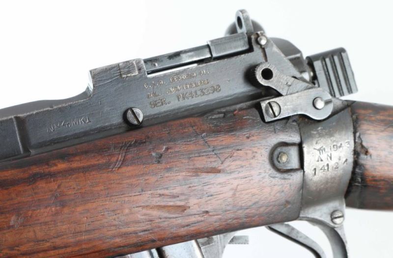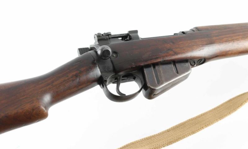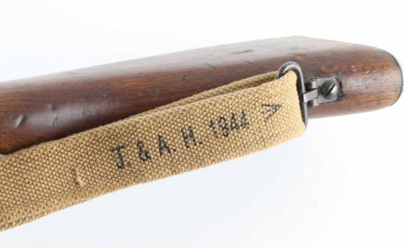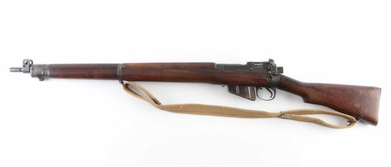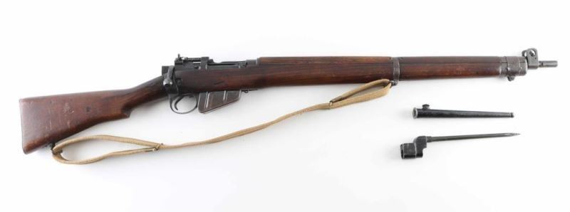 British military bolt action rifle, imported by CAI, Georgia VT. Features 25" barrel, bayonet lug, blade front sight with protector ears, receiver mounted peep rear sight with flip up elevator ladder, sling swivels, 10 round detachable magazine, stripper clip bridge, manual safety, trap door in butt. Bore is good condition, mostly bright with strong rifling, some dark spots that might disappear with a good cleaning. Metal surfaces show 80% coverage dark brownish color finish, darker in protected areas, bare metal on sharp edges and corners. Stock is very good condition with dings and scrapes. Importer has applied a new serial number on left side of receiver. Includes very good condition spike bayonet with metal scabbard, good condition tan cloth web sling (marked "J & A H / 1944 / (broad arrow"). Condition is NRA Very Good *** C&R Firearm ***
