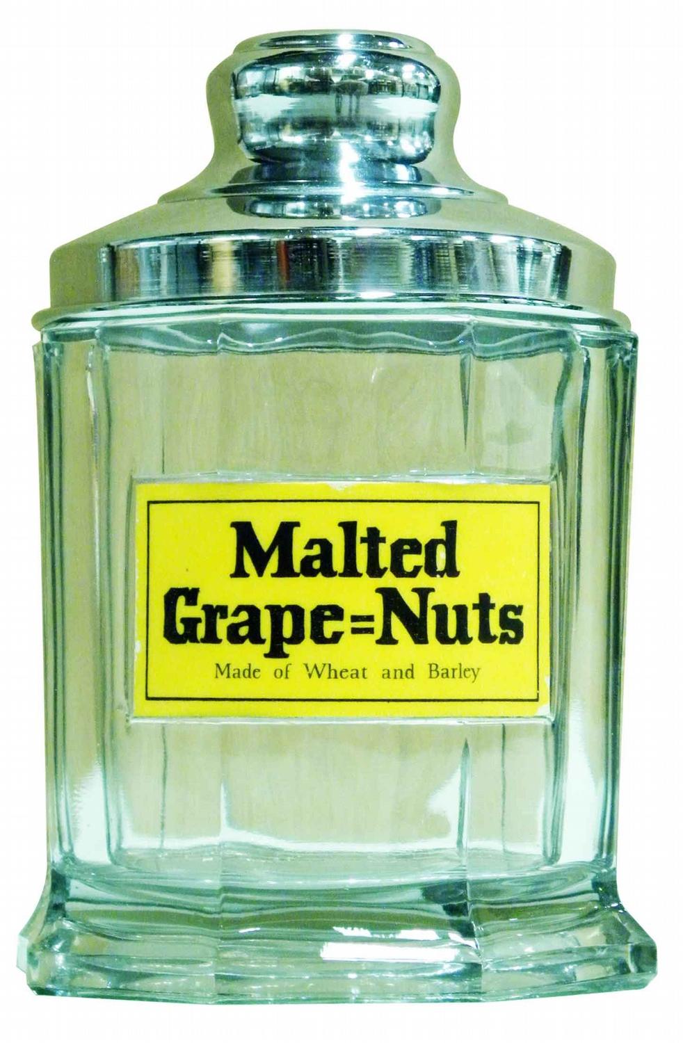 Malted Grape-Nuts Canister. Milk glass label. Hexagon shape clear glass, aluminum lid. Near mint condition. 5 1/2 inch diameter X 8 1/4 inches tall.